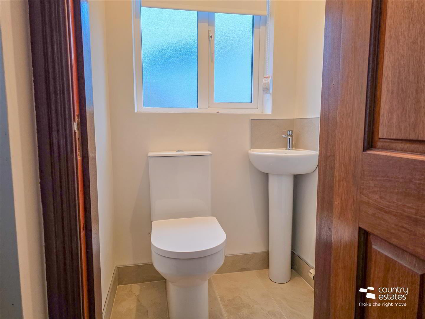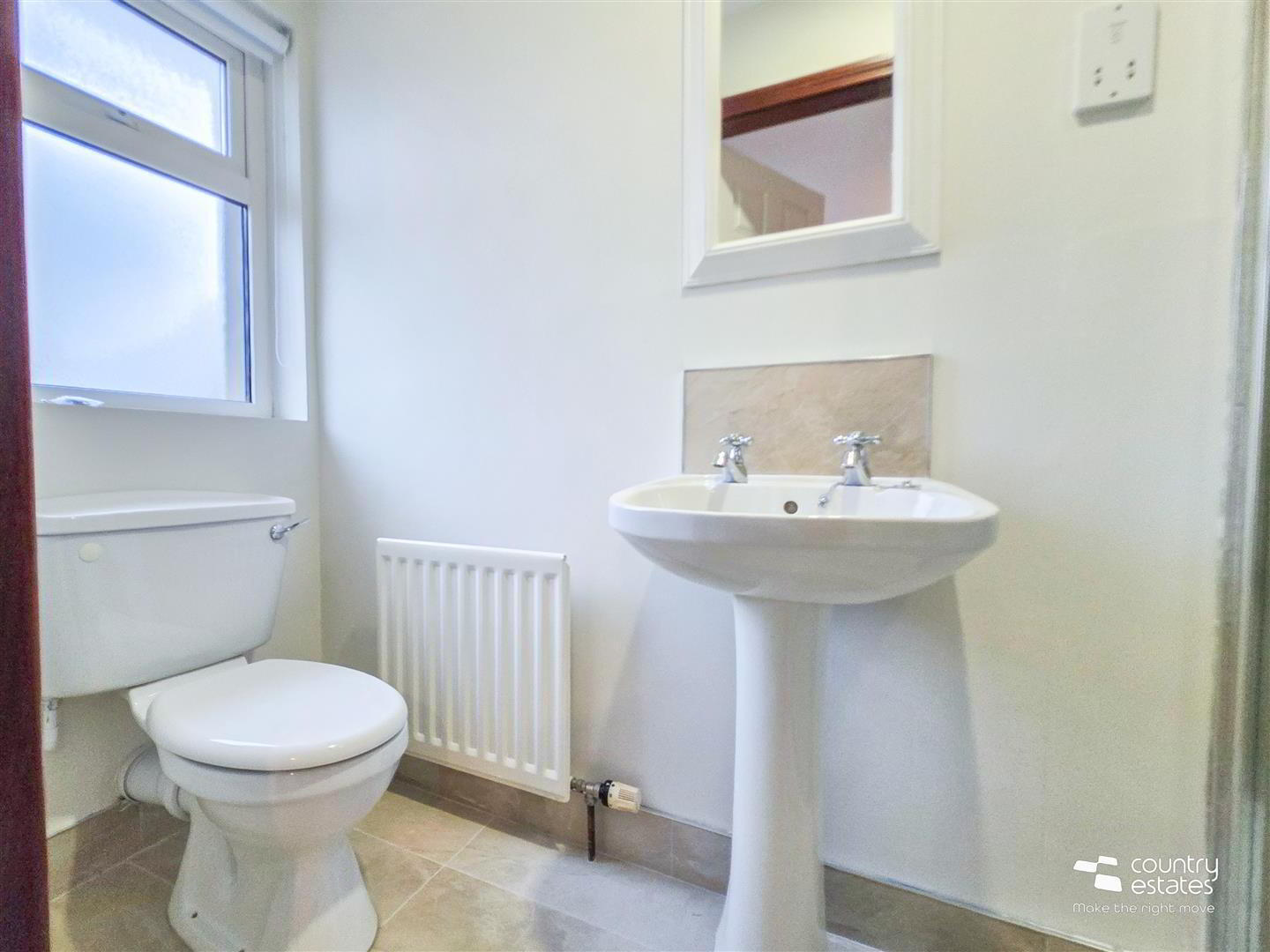 - Comprising button flush WC and pedestal wash hand basin. Tiled floor.
