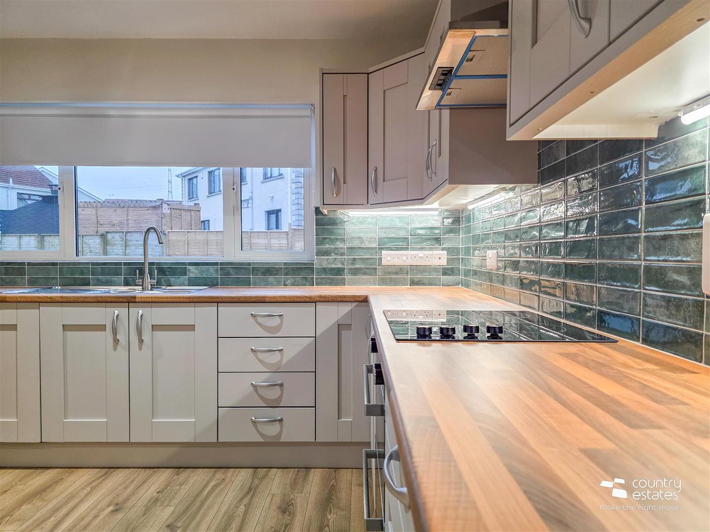 - Equipped with a comprehensive range of high and low level shaker style fitted units in Dove grey finish with contrasting wood effect work surfaces. Inlaid single drainer stainless steel sink unit with swan neck mixer tap. A range of integrated appliances to include oven, four ring hob with overhead extractor fan housed in stainless steel canopy, dishwasher and fridge freezer. Complementary wall tiling.