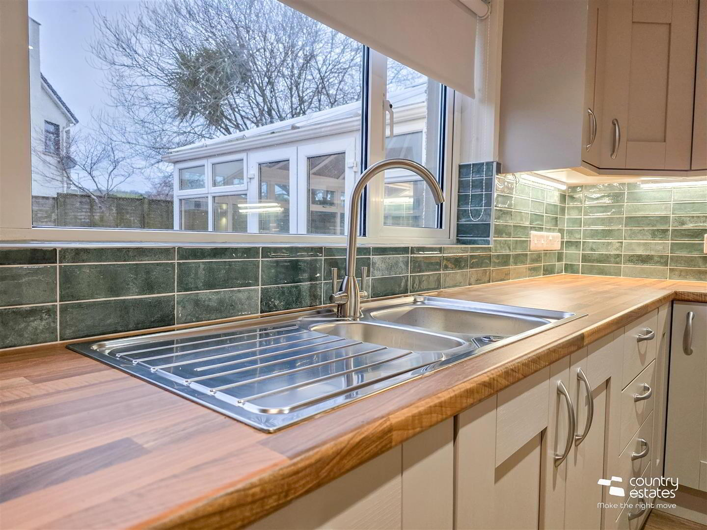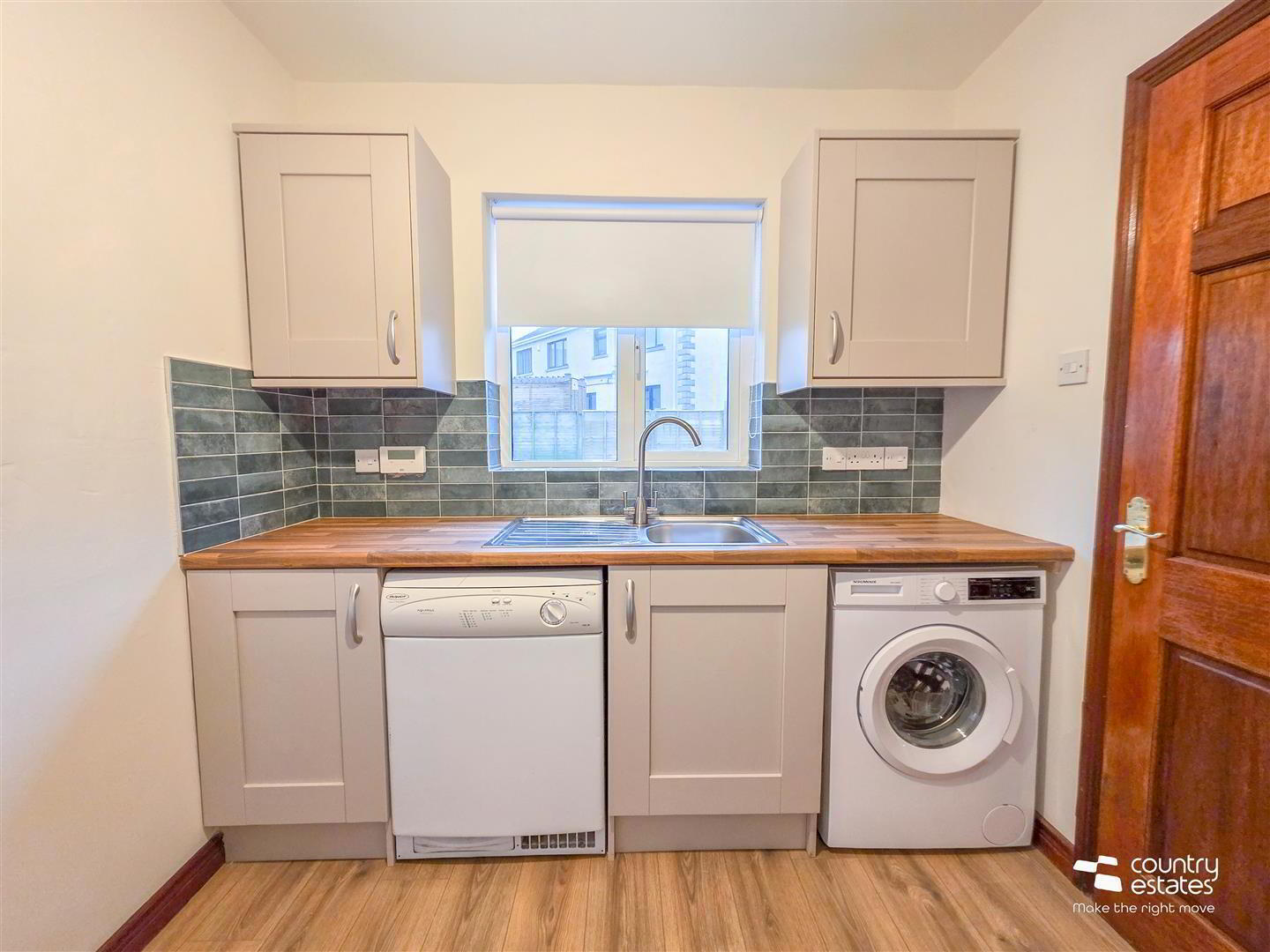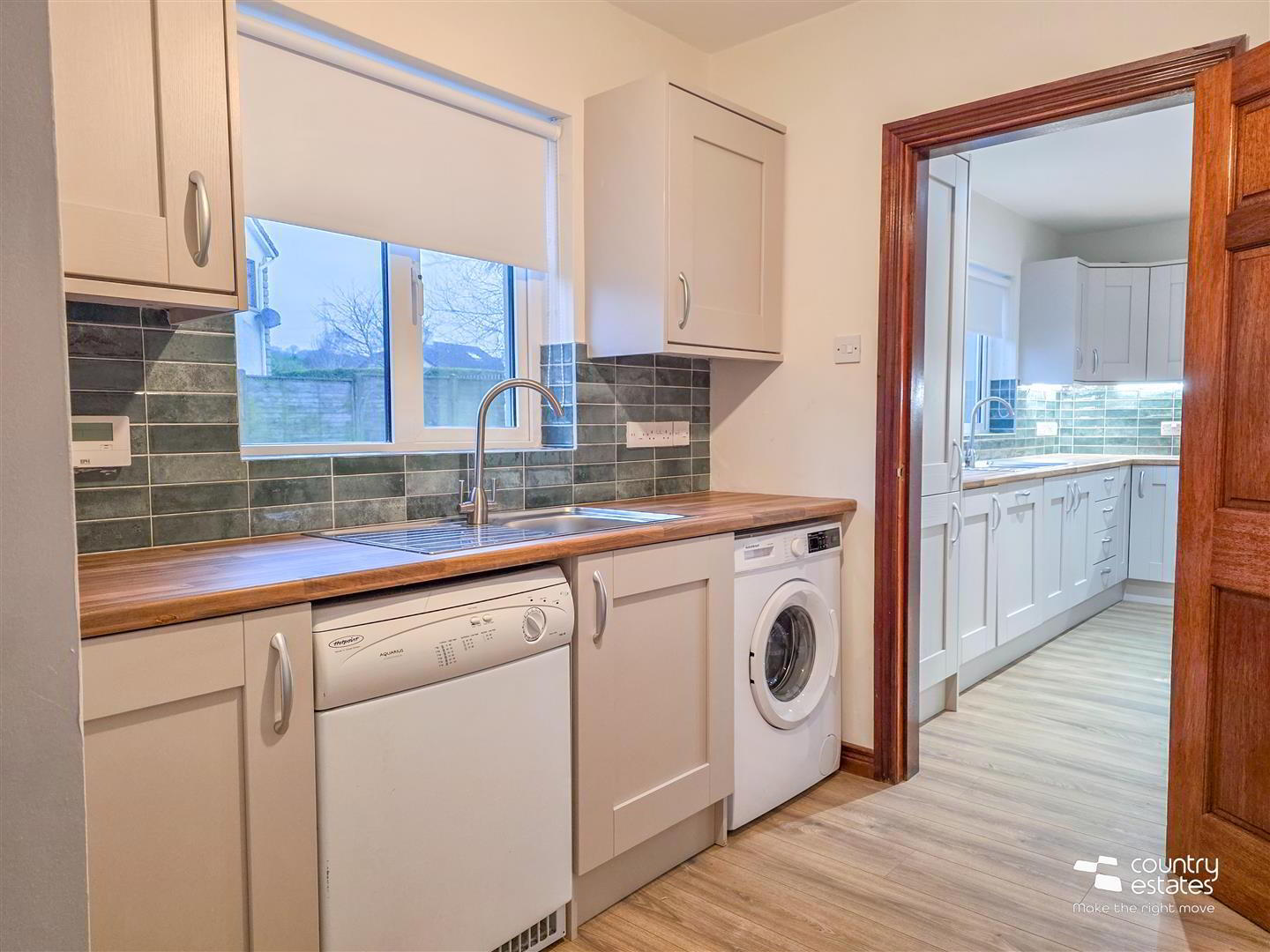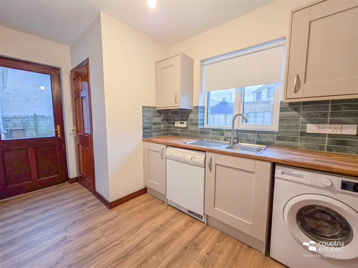 - Equipped with a matching range of shaker style fitted units with contrasting wood effect work surfaces. Inlaid single drainer stainless steel sink unit with swan neck mixer tap. Plumbed for washing machine. External door to side.