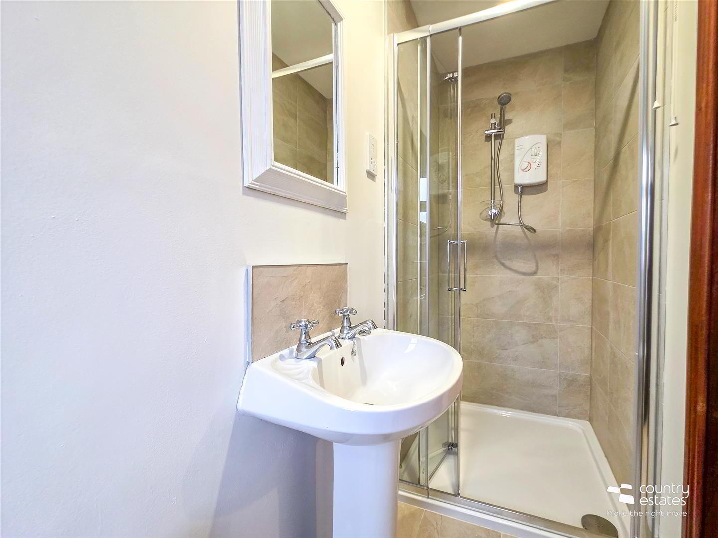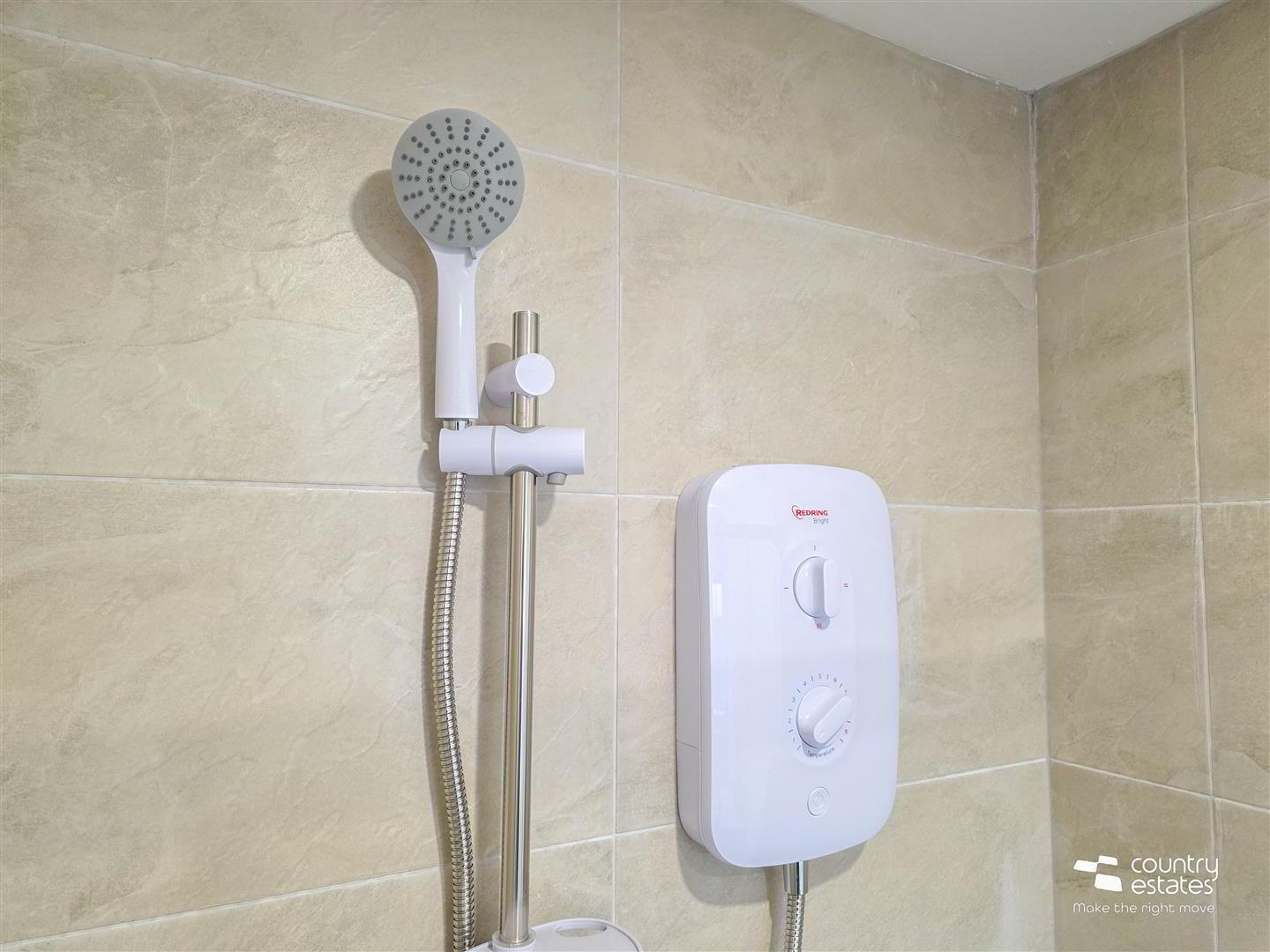 - Comprising button flush w.c, modern vanity unit with monobloc tap and fully tiled shower enclosure with electric shower unit. Tiled floor.