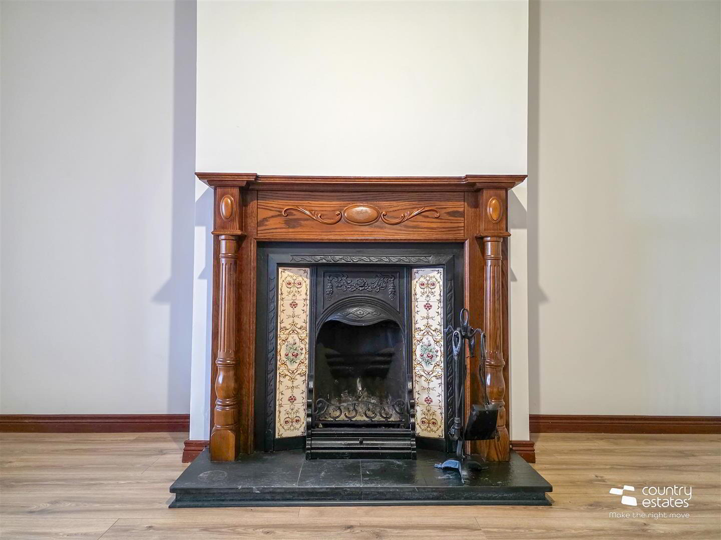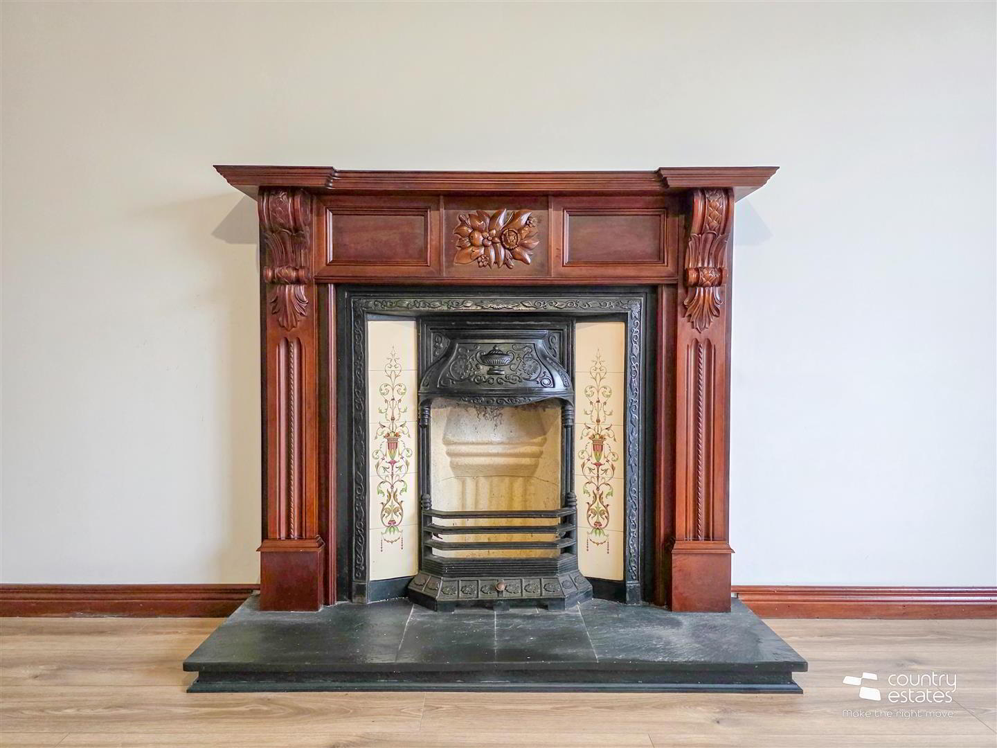 - Period style fireplace with ornate tiled inset and mahogany surround. Slate hearth.