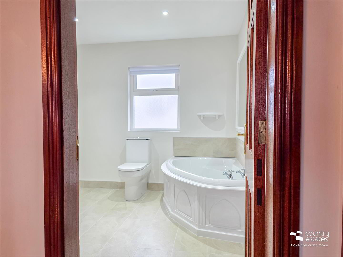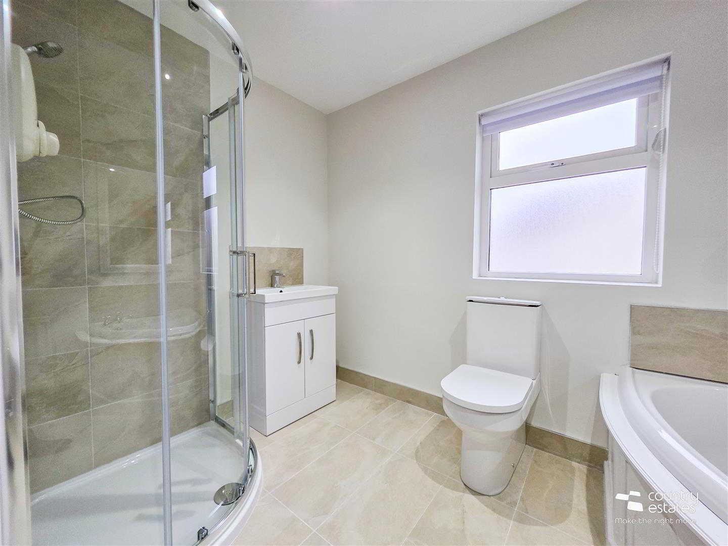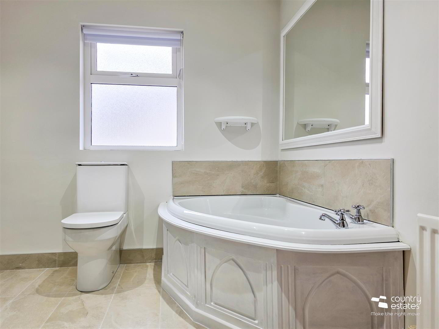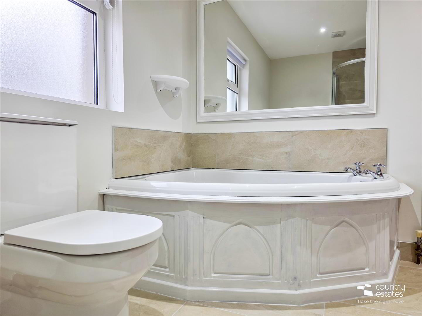 - Four piece family bathroom comprising offset corner bath with tiled splashback, button flush wc, modern vanity unit in gloss white finish with mono block tap and tiled splasback. Fully tiled corner rounded shower cubicle with electric shower unit. Tiled floor.