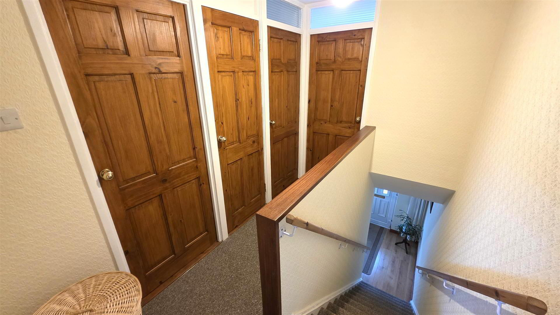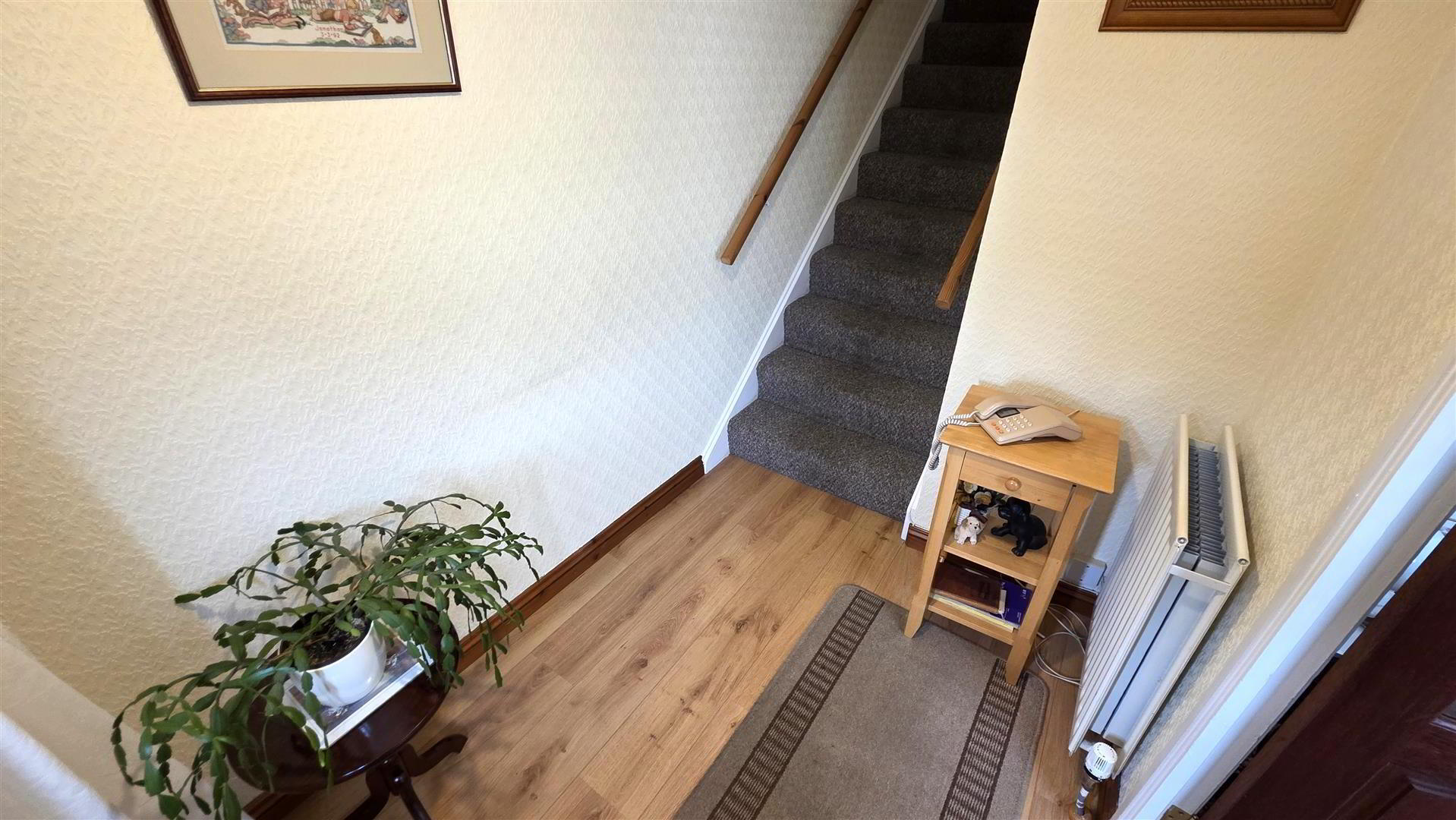- Staircase to first floor with two handrails. Wood laminate flooring. Double radiator. 6 panel bevelled glass door to;