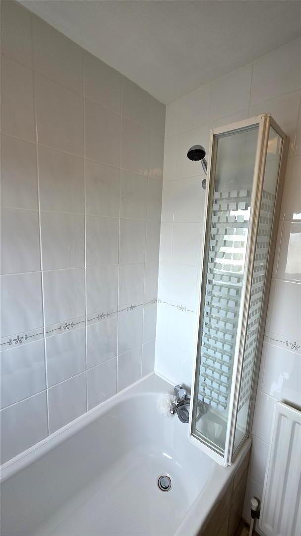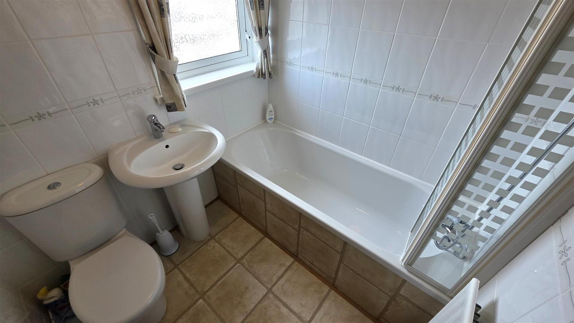 - Modern white suite comprising a panel bath with chrome hot and cold taps, shower over and partially glazed folding door. Pedestal wash hand basin with 'Monobloc' chrome mixer tap. Low flush push button WC. Fully tiled walls. Extractor fan. Single radiator.