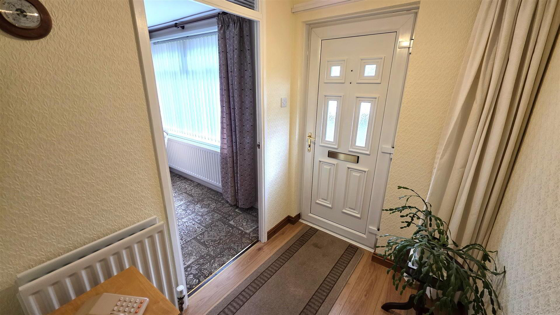 - Neat lawn. Mixed stone bedding. Concrete pathway to front door with canopy over. PVC double glazed door to