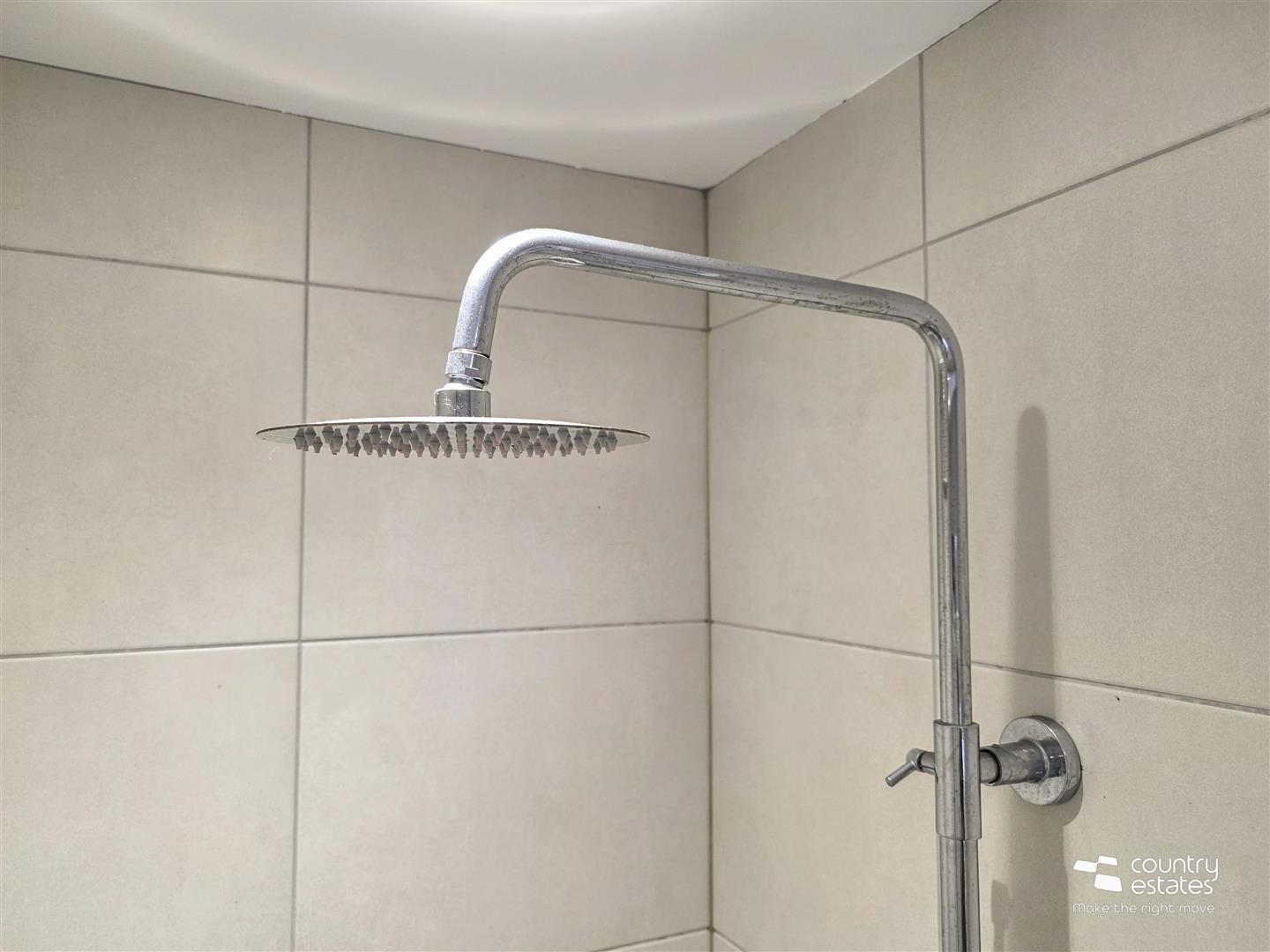 - Comprising fully tiled shower cubicle with thermostatically controlled drench style shower and hand shower attachment, semi-pedestal wash hand basin with monobloc tap and tiled splashback, and button flush WC. Tiled floor. Recessed down lighting.