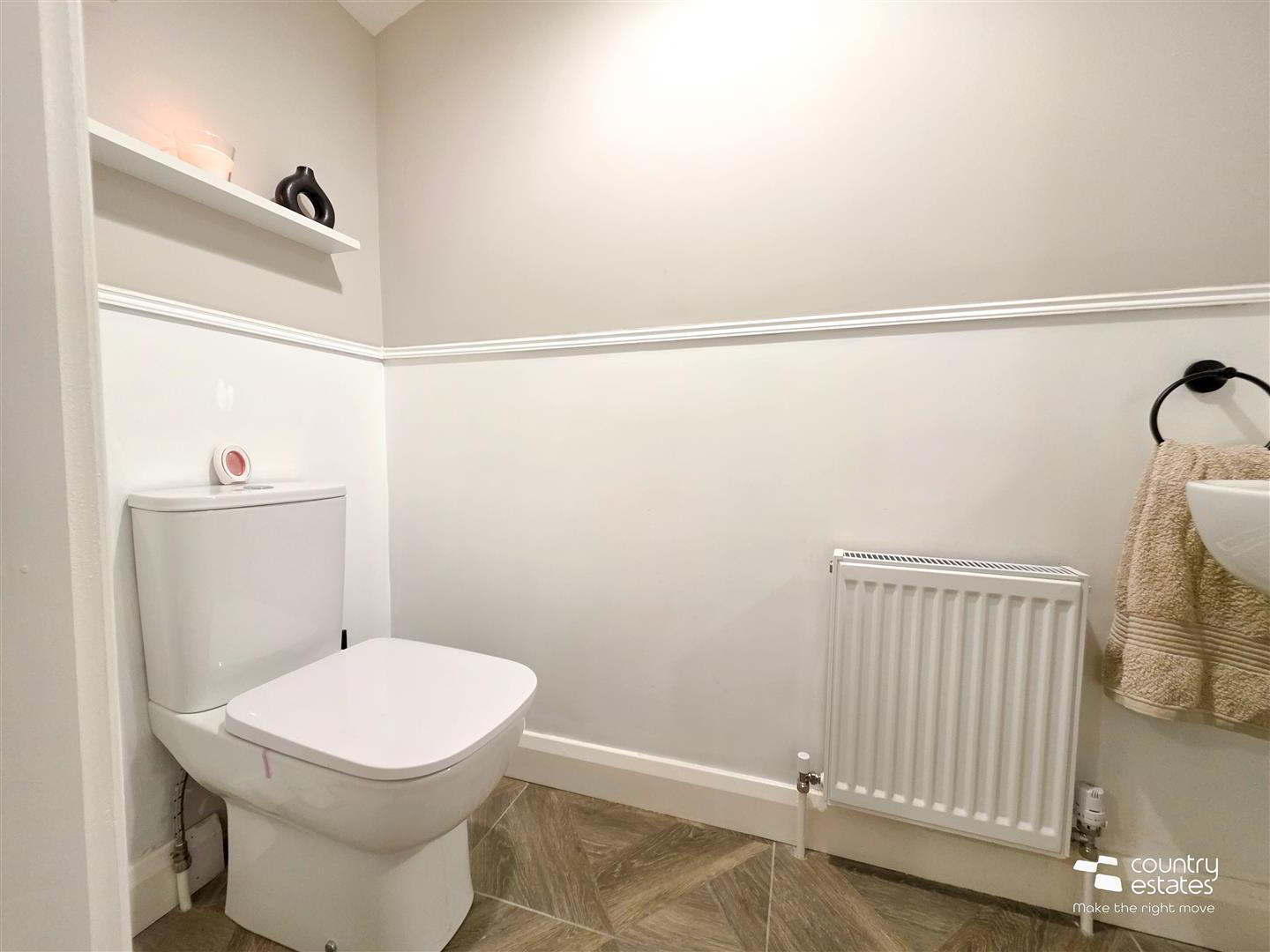 - Comprising panel bath with hand shower, fully tiled quadrant shower cubicle with thermostatically controlled drench style shower and hand shower attachment, semi-pedestal wash hand basin with monobloc tap and a button flush WC. Tiled floor. Part tiled walls. Chrome towel radiator. Recessed down lighting.