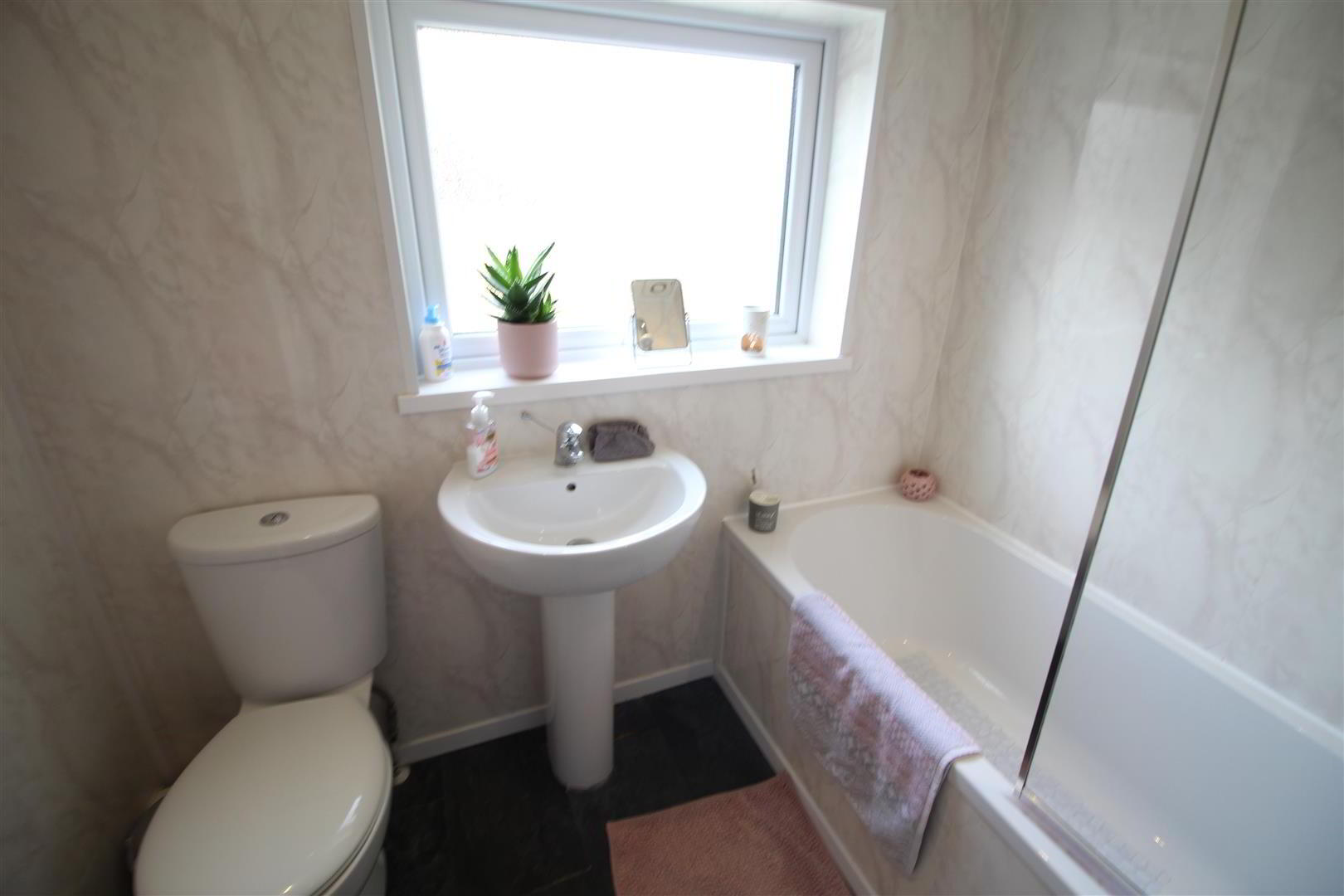 Comprising button flush w.c, pedestal wash hand basin with mono block tap, panelled bath with fixed shower screen and electric shower over. PVC panelled walls and ceiling.