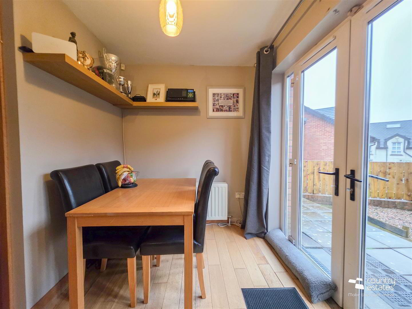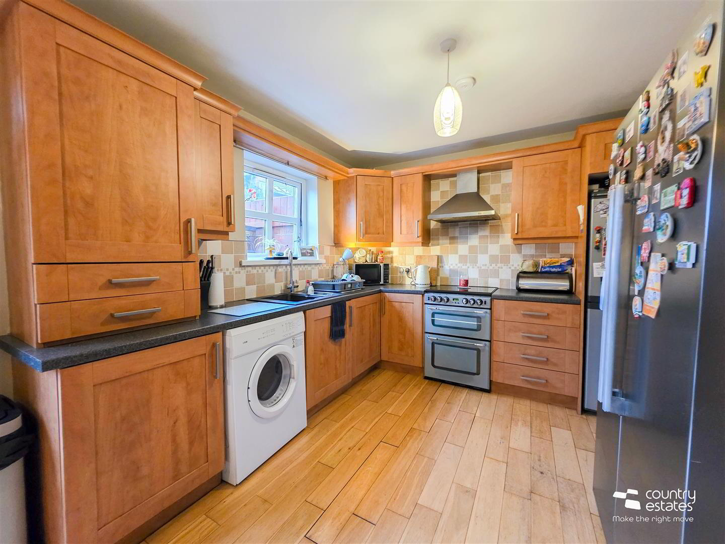 - Equipped with a comprehensive range of high and low level shaker style fitted units. One and a half bowl single drainer composite sink unit with swan neck mixer tap. Space for free standing oven with over head extractor fan housed in stainless steel canopy. Space for free standing fridge freezer. Space for tumble dryer. Part tiled walls. Ample space for casual dining. Double glazed French doors to rear. Hard wood flooring.