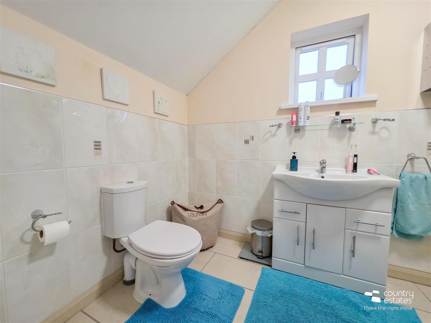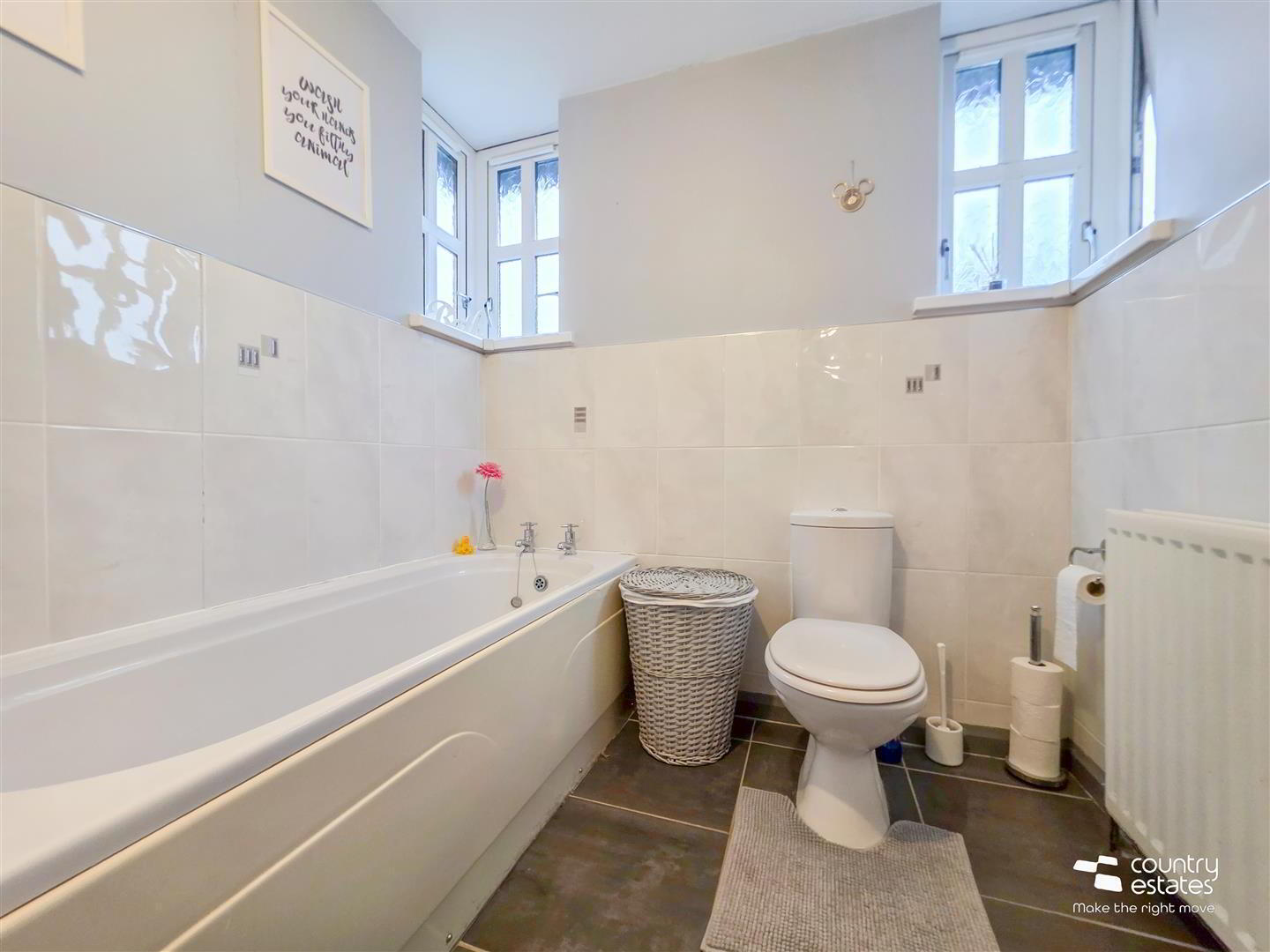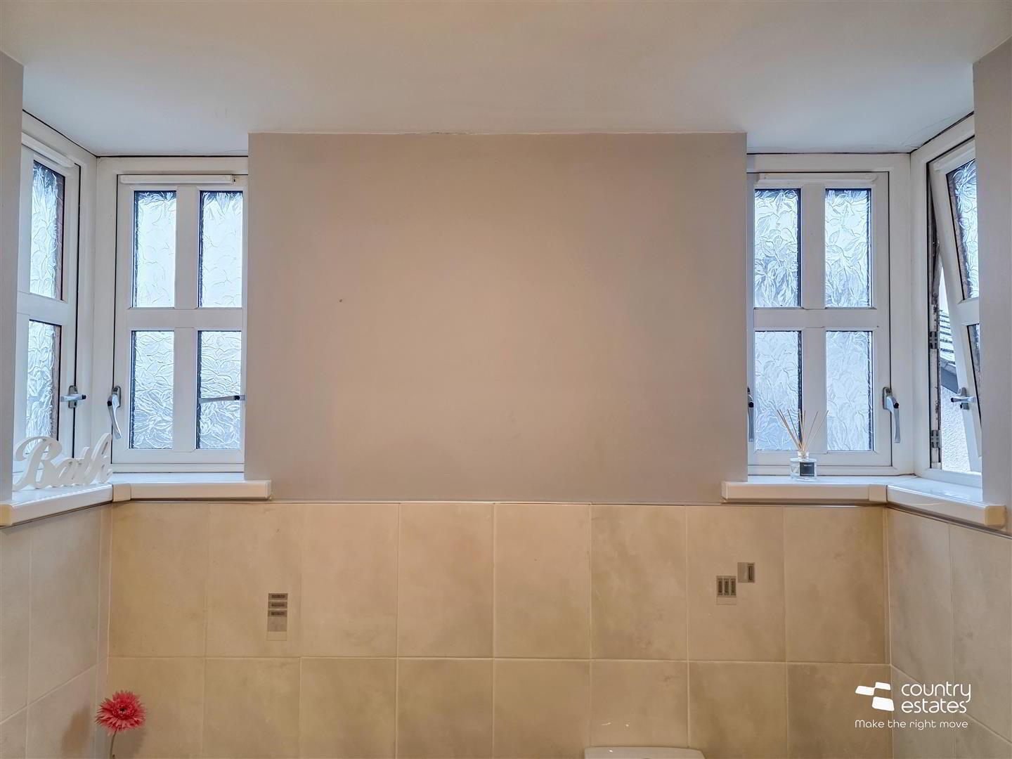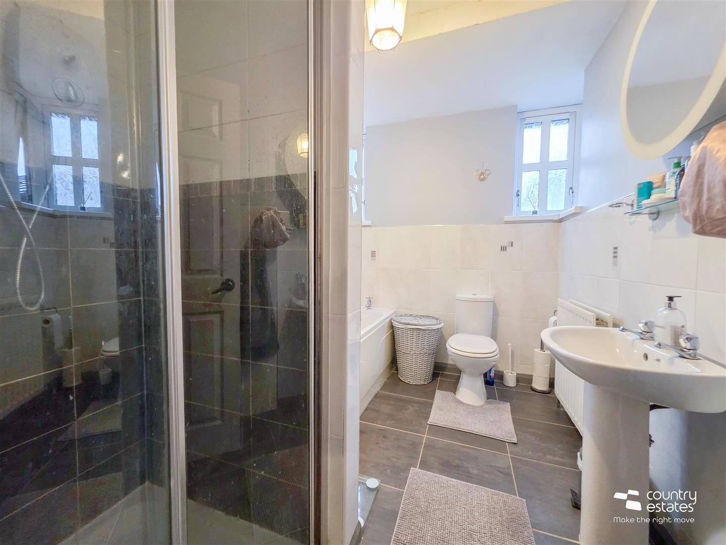 - Four piece suite comprising panel bath, fully tiled shower enclosure with electric shower unit, pedestal wash hand basin, and a button flush WC. Tiled floor. Feature corner windows. Part tiled walls.