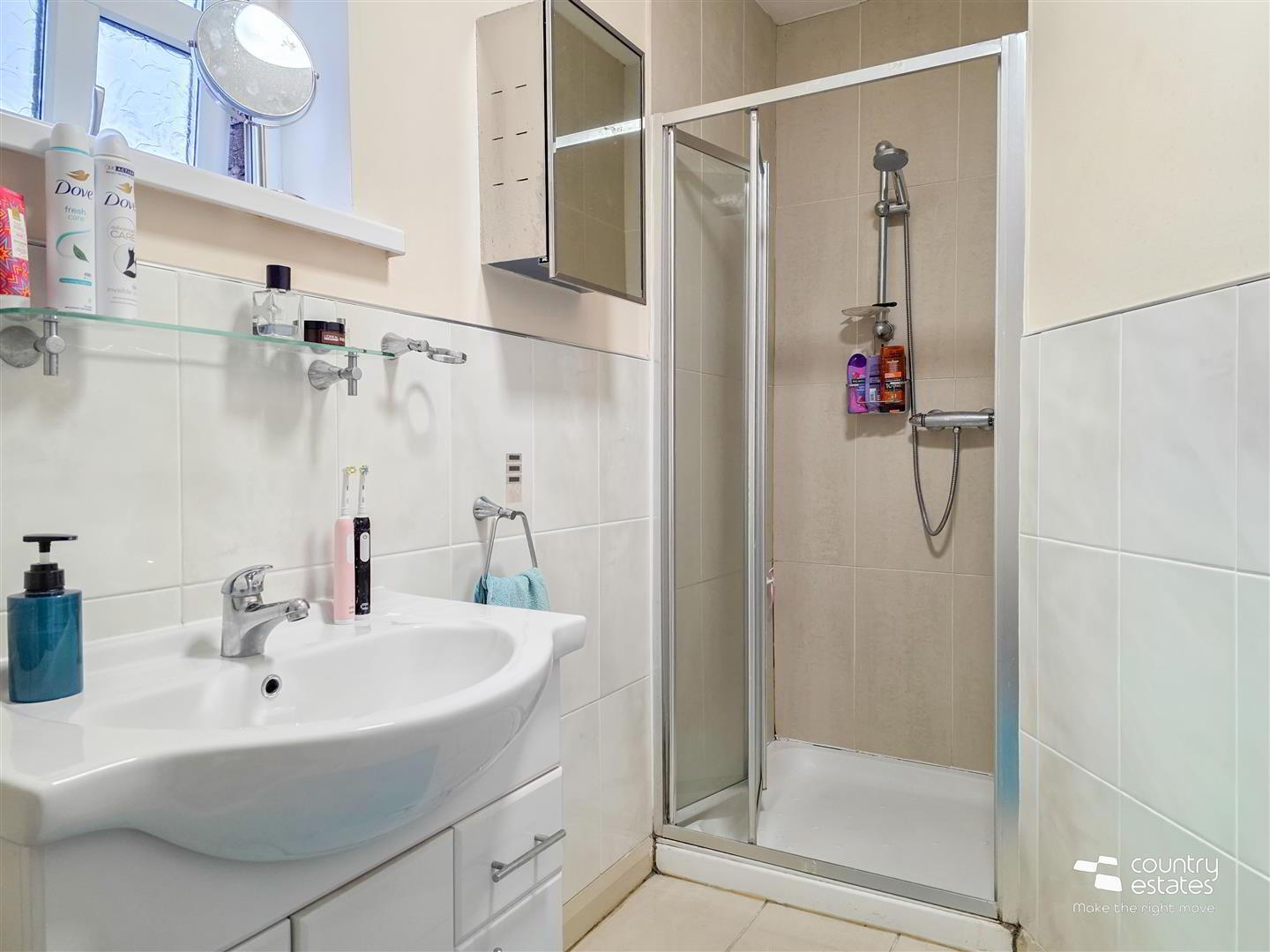 - Comprising fully tiled shower cubicle with thermostatically controlled shower, vanity wash hand basin with monobloc tap and a button flush WC. Tiled floor. Part tiled walls.