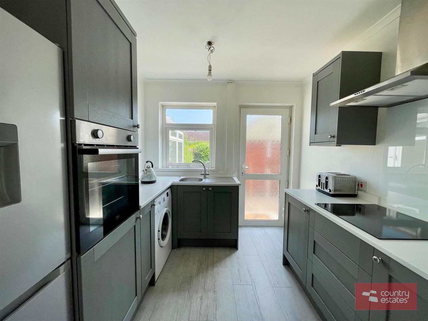 Equipped with a range of high and low level shaker style fitted units with contrasting worksurfaces. Single drainer stainless steel sink unit. Integrated eye level oven. Seperate 4 ring hob with overhead extractor fan housed in stainless steel canopy. Plumbed for washing machine. PVC Double Glazed door to garden.