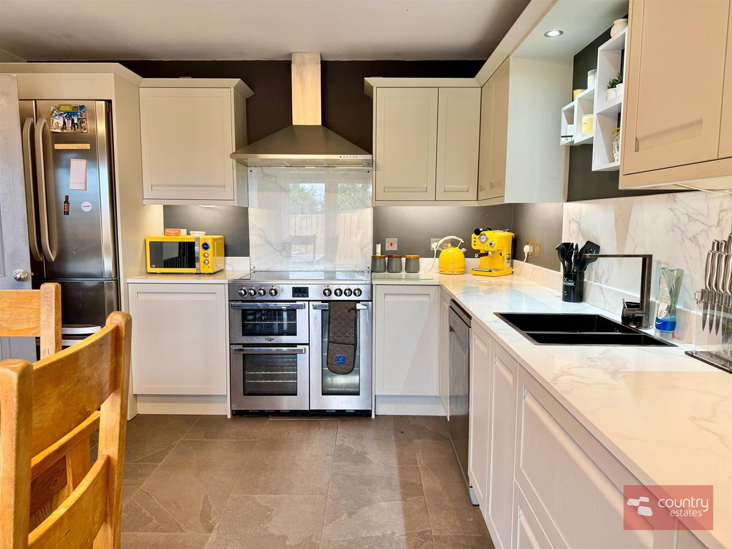 - Equipped with a comprehensive range of high and low level modern fitted units with co-ordinating work surfaces. Inlaid sink unit with mixer tap. Space for freestanding range style cooker and overhead extractor fan housed in stainless steel canopy. Housing for freestanding fridge/ freezer. Plumbed for dishwasher. Twin PVC double glazed French doors to patio and garden.