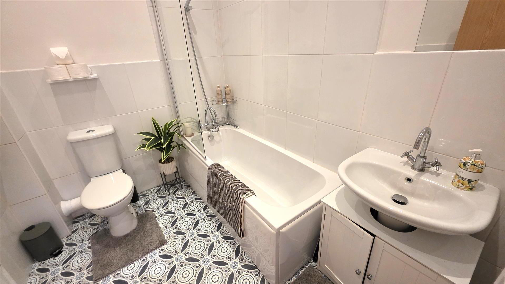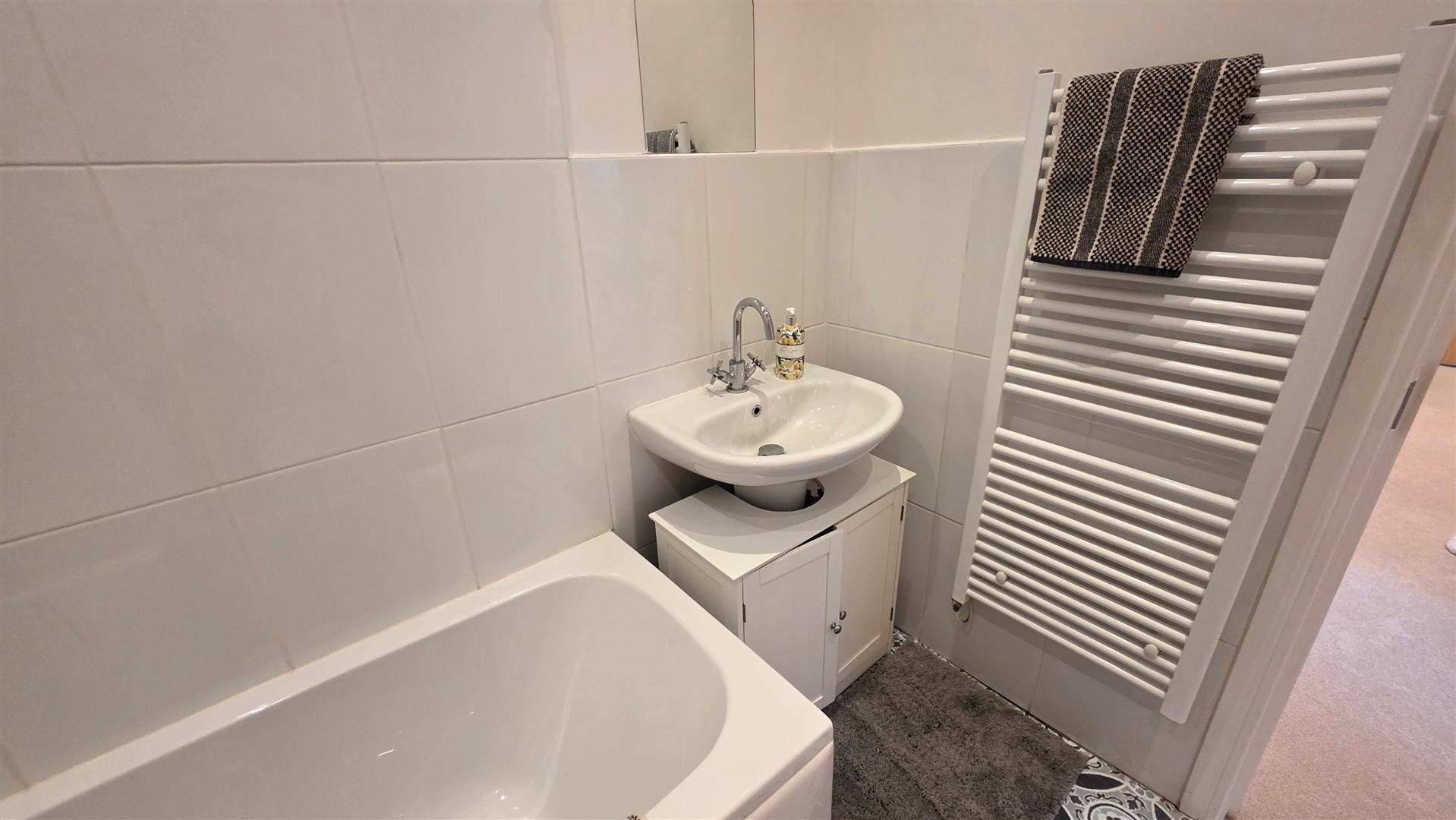 - Modern white three piece suite comprising a panel bath with chrome mixer tap, shower over, tiled splashback and partially glazed screen. Pedestal wash hand basin with chrome mixer tap. Low flush push button WC. Low voltage downlights. Extractor fan. Fully tiled floor and partially tiled walls. Electric Towel radiator and double radiator.