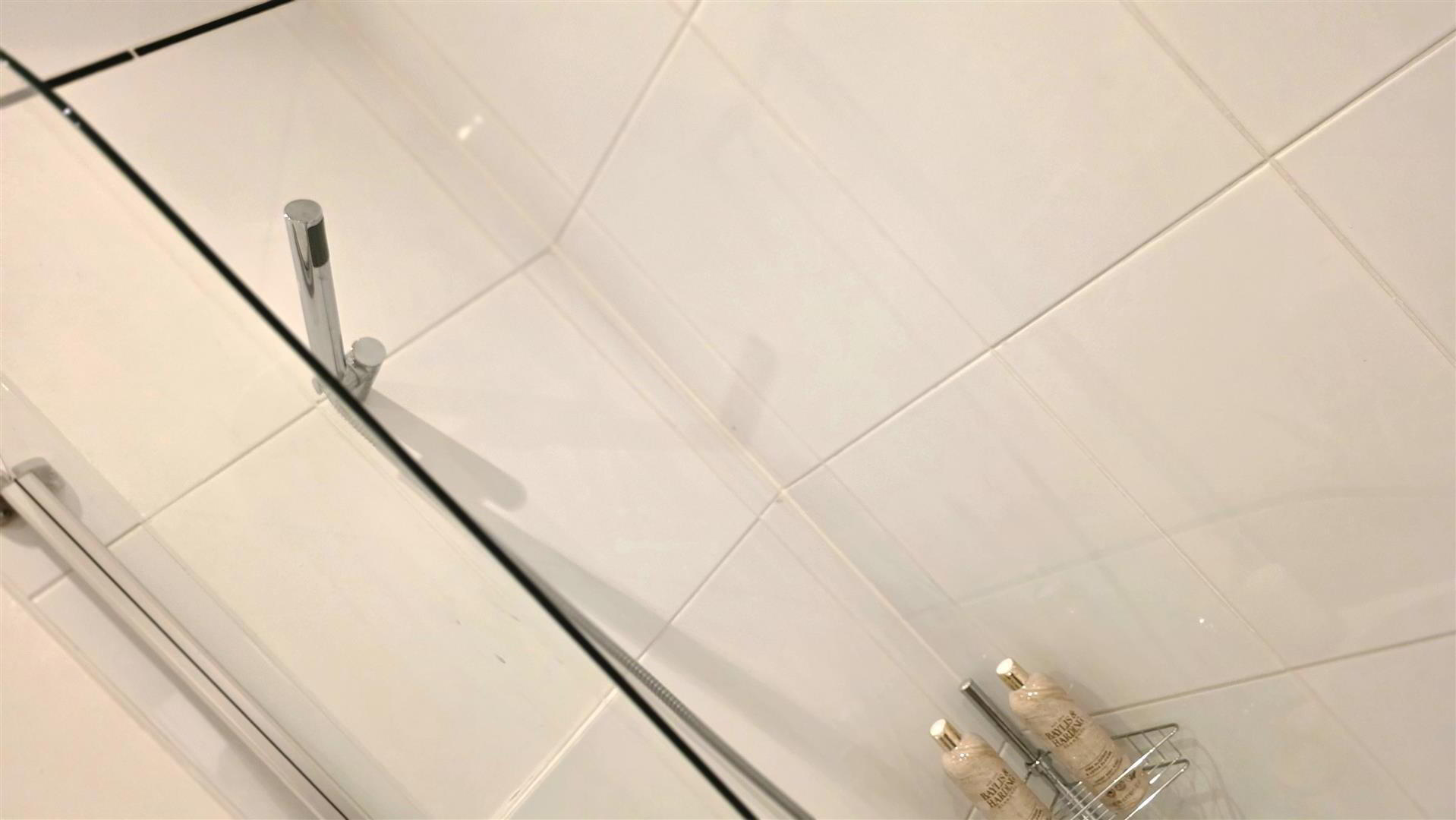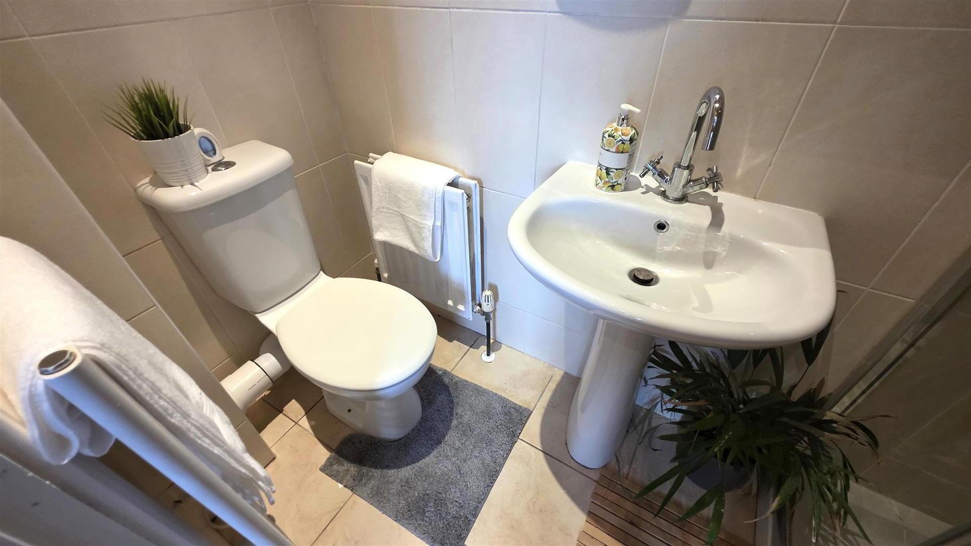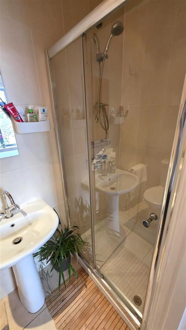 - Modern white three piece suite comprising a wall to wall enclosed shower unit with partially glazed sliding door. Pedestal wash hand basin with chrome mixer tap. Low flush push button WC. Fully tiled walls and floors. Extractor fan. Low voltage downlights. Electric Towel radiator and additional double radiator.