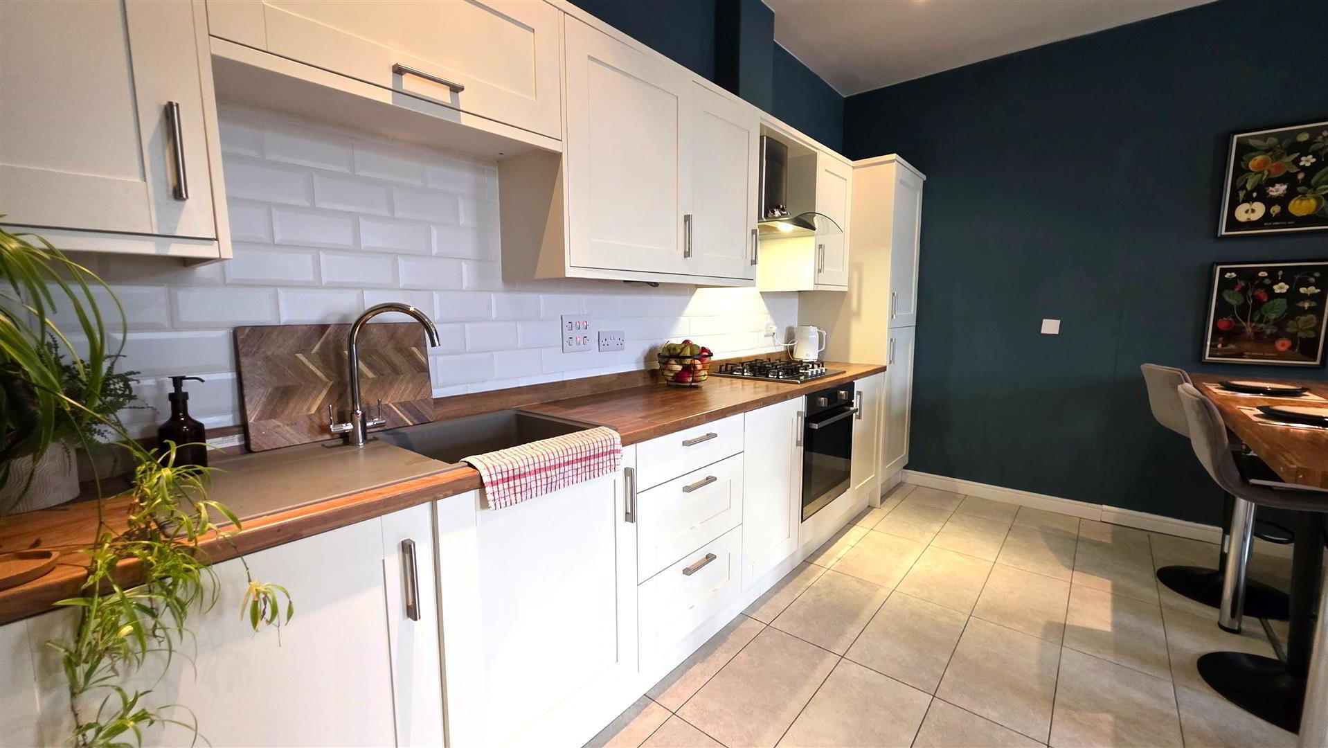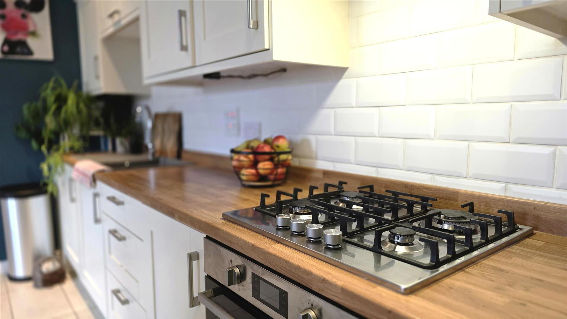 - Recently fitted range of cream 'Shaker' style high and low level kitchen units with complimentary 'Butcher Bloc' style work surfaces and splashback tiling. Custom breakfast bar style peninsula with matching work surfaces. Single drainer composite sink unit with chrome mixer tap. Integrated appliances to include a four ring gas hob with part glass part stainless steel overhead extractor fan, a low level combination oven and grill, fridge freezer washing machine. Low voltage downlights. Fully tiled floor to the kitchen area.