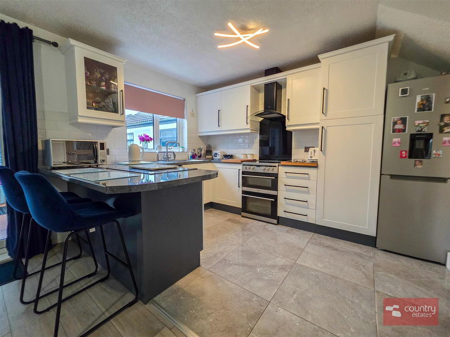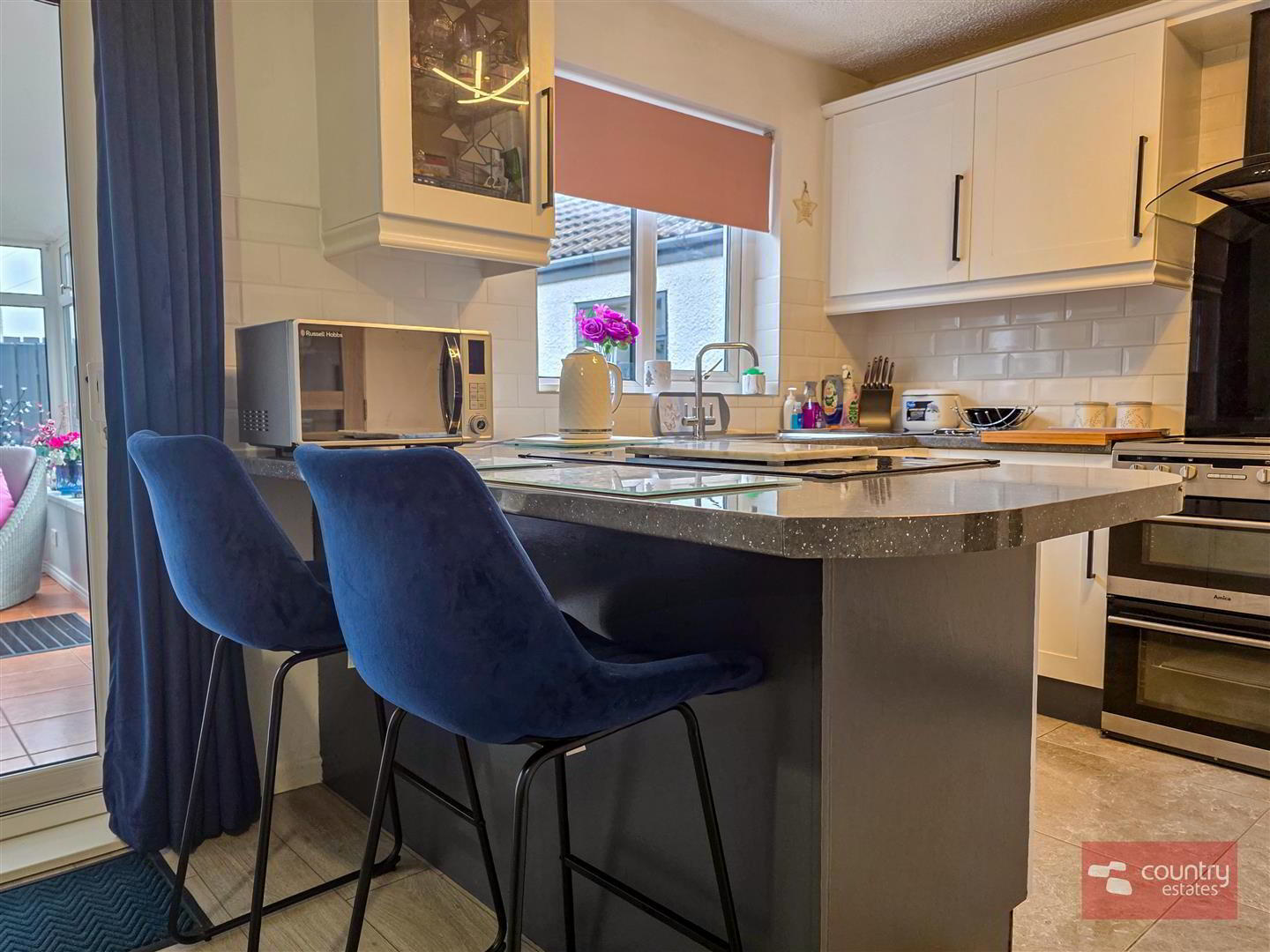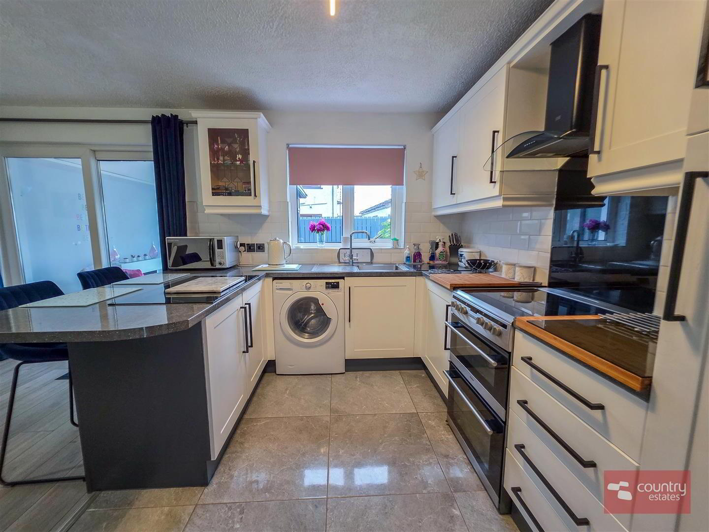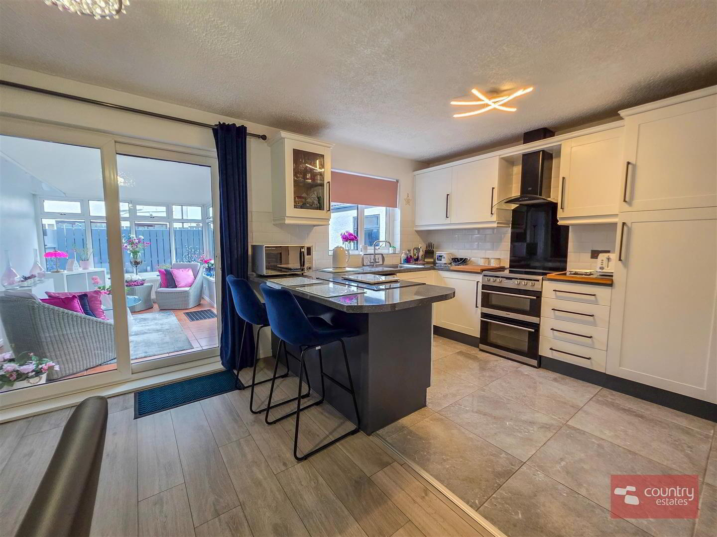 - Equipped with a comprehensive range of high and low level shaker style fitted units and contrasting work surfaces and breakfast bar style return. Single drainer stainless steel sink unit with swan neck mixer tap. Space for free standing oven with overhead extractor fan housed in stainless steel canopy with glass hood. Plumbed for washing machine. Space for free standing fridge freezer. Tiled floor. Part tiled walls in metro brick style. Quality laminate flooring to dining aspect. PVC double glazed sliding door to:
