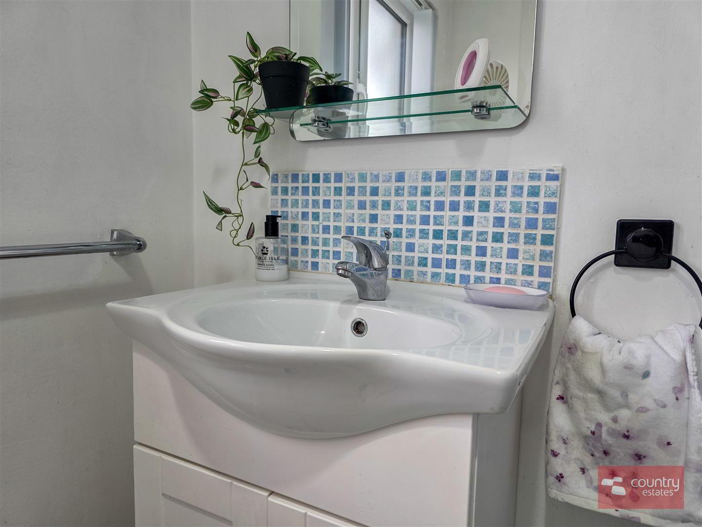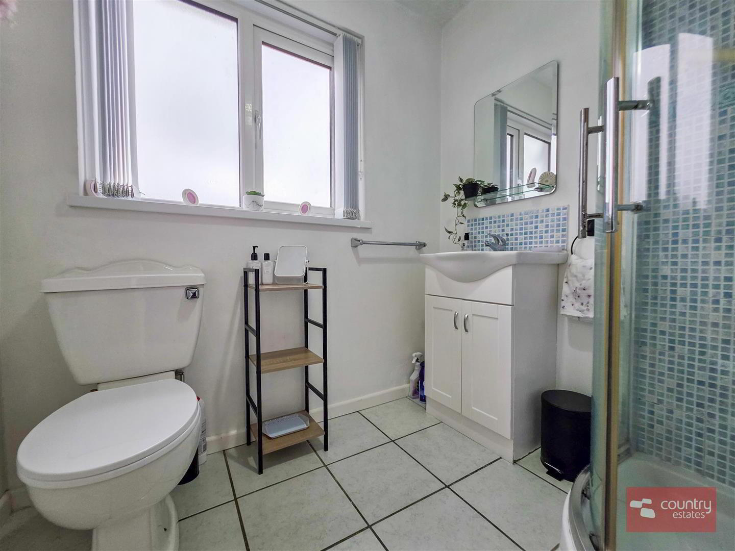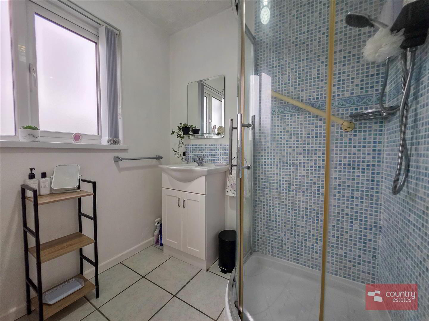 - Comprising fully tiled quadrant shower cubicle with electric shower unit, vanity wash hand basin with monobloc tap and tiled splash back and a button flush WC. Tiled floor.