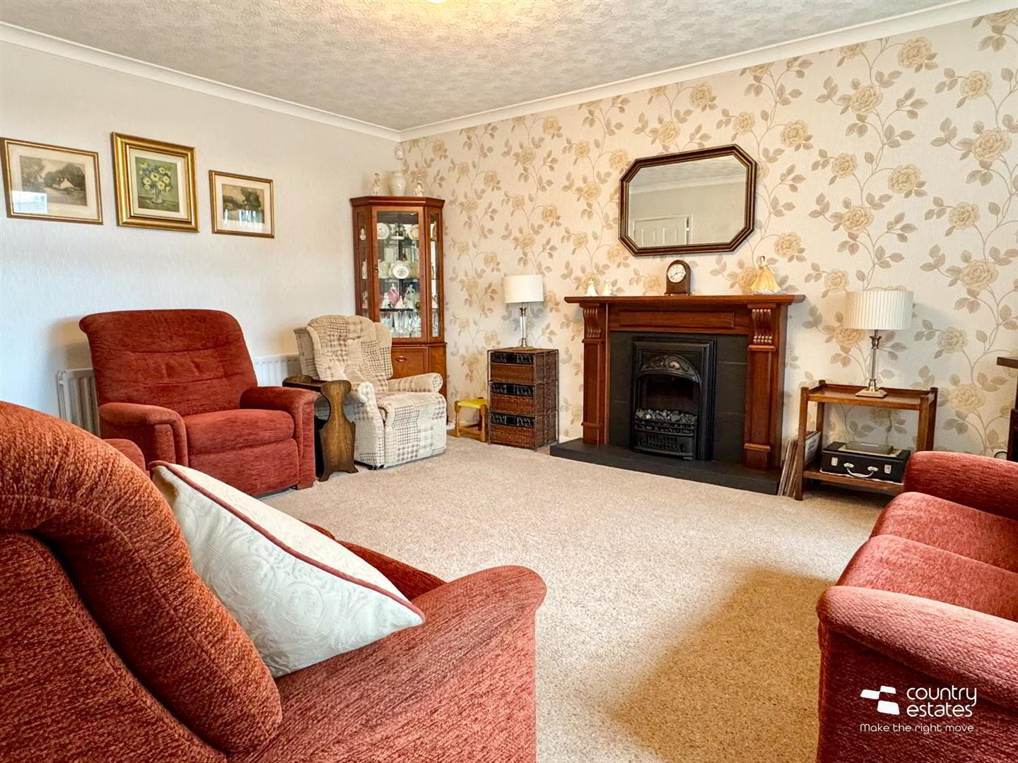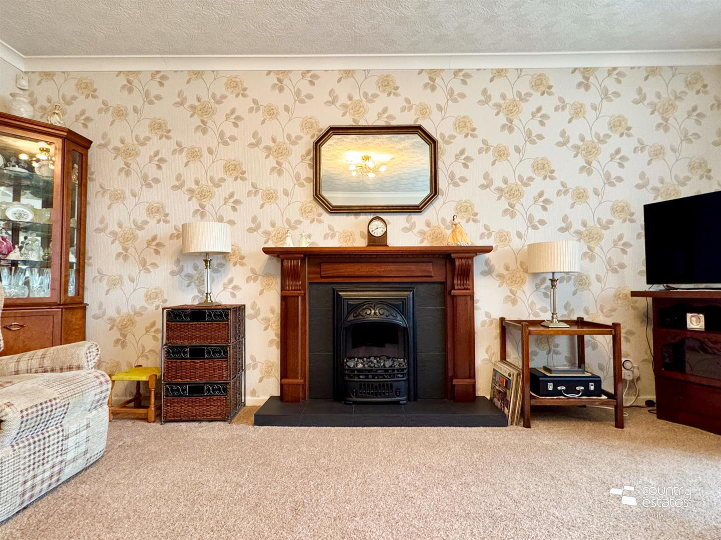 - Attractive fireplace with black slate inset, matching hearth and wooden surround. Picture style window.