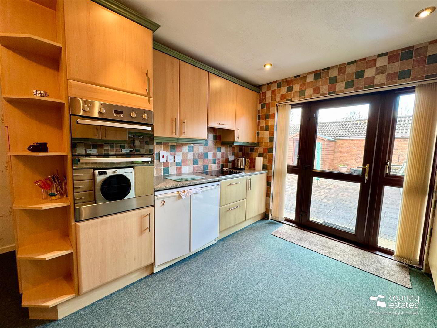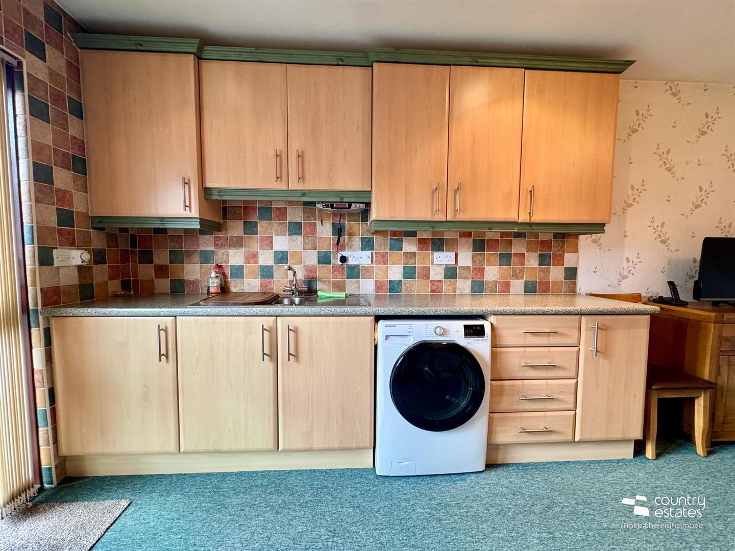 - Equipped with a comprehensive range of high and low level fitted units with contrasting worksurfaces. Single drainer stainless steel sink unit. Integrated eye level oven with separate four ring hob and concealed overhead extractor. Open ended corner displays. Space for freestanding under counter fridge/ freezer. Part tiled walls. External PVC double glazed door to garden with matching full height side screen.