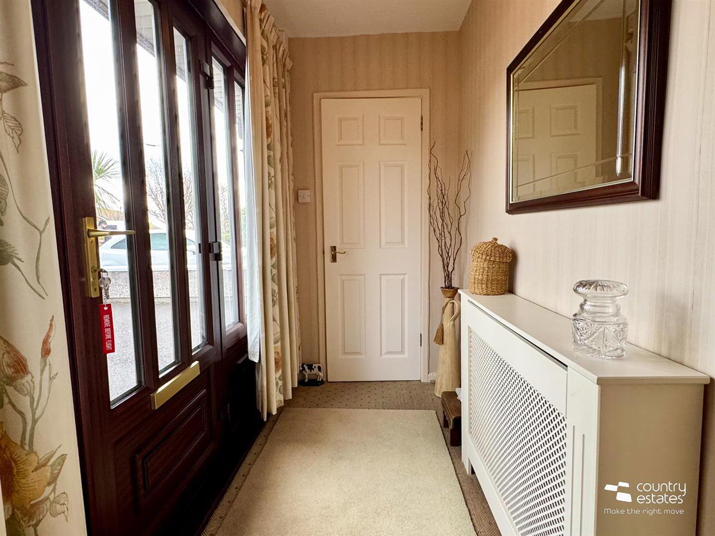- Mahogany effect PVC double glazed front door with matching full height double glazed side screens into:-