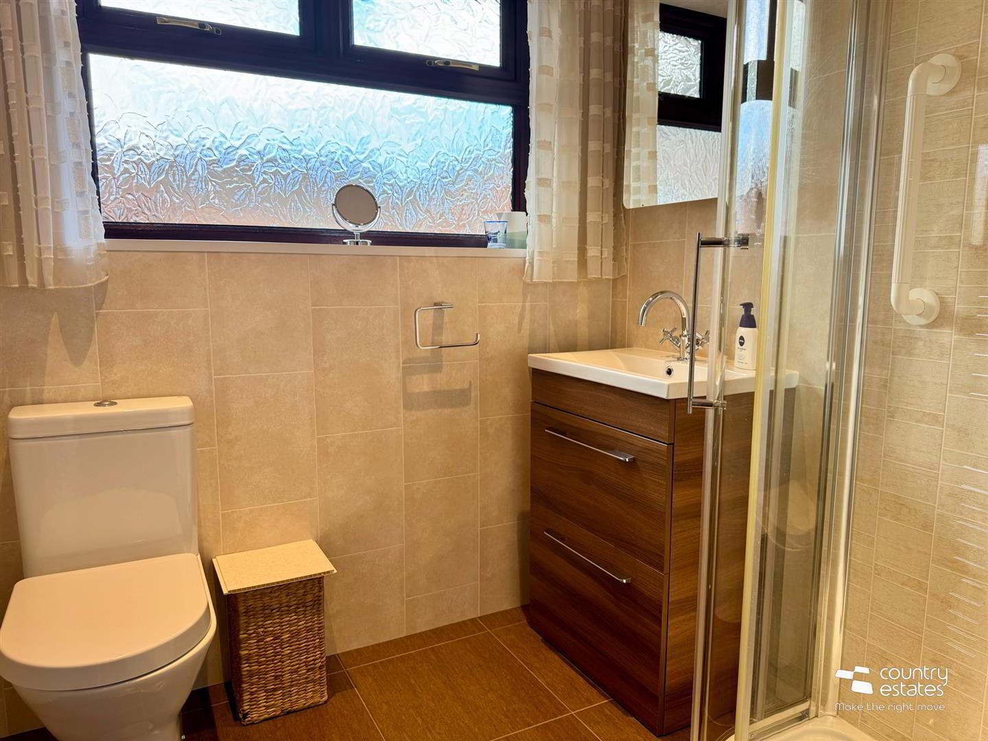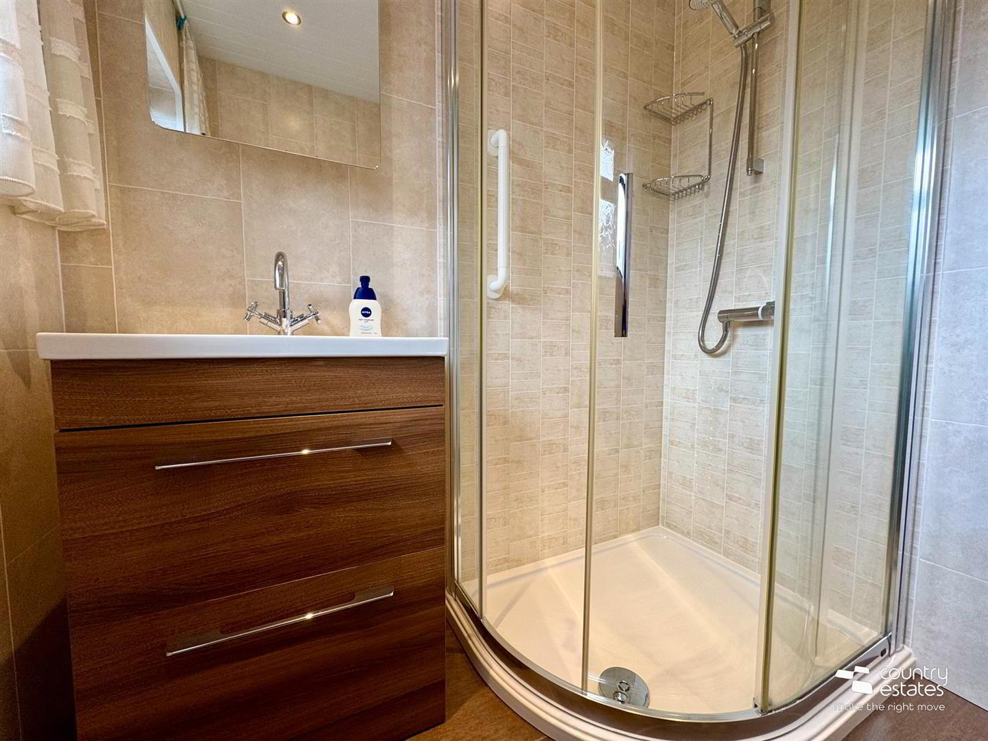 - Comprising button flush w.c, modern walnut effect vanity unit with monobloc tap and quarter rounded enclosure with thermostatically controlled shower. Stone effect PVC wall panelling. PVC panel ceiling.