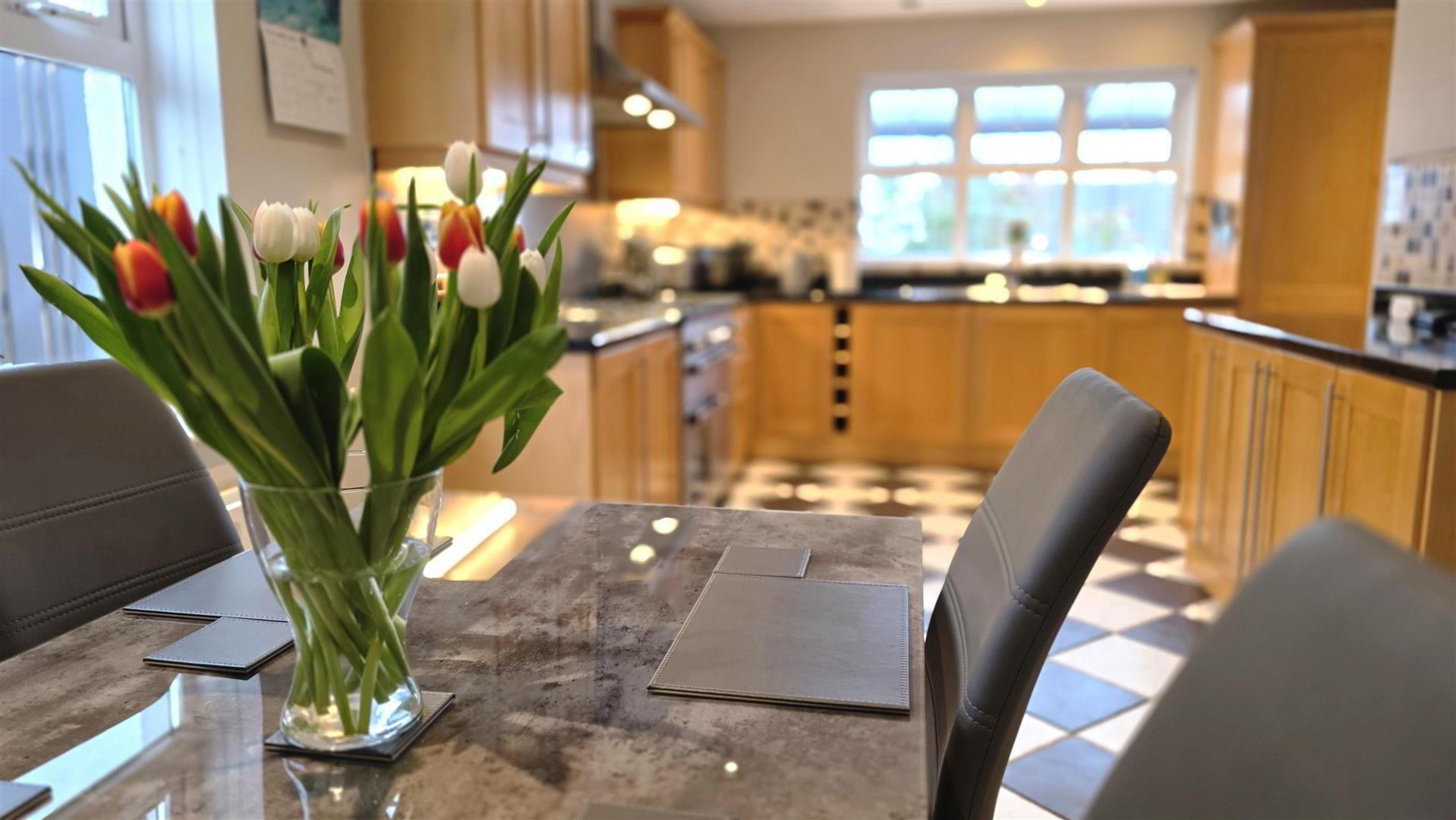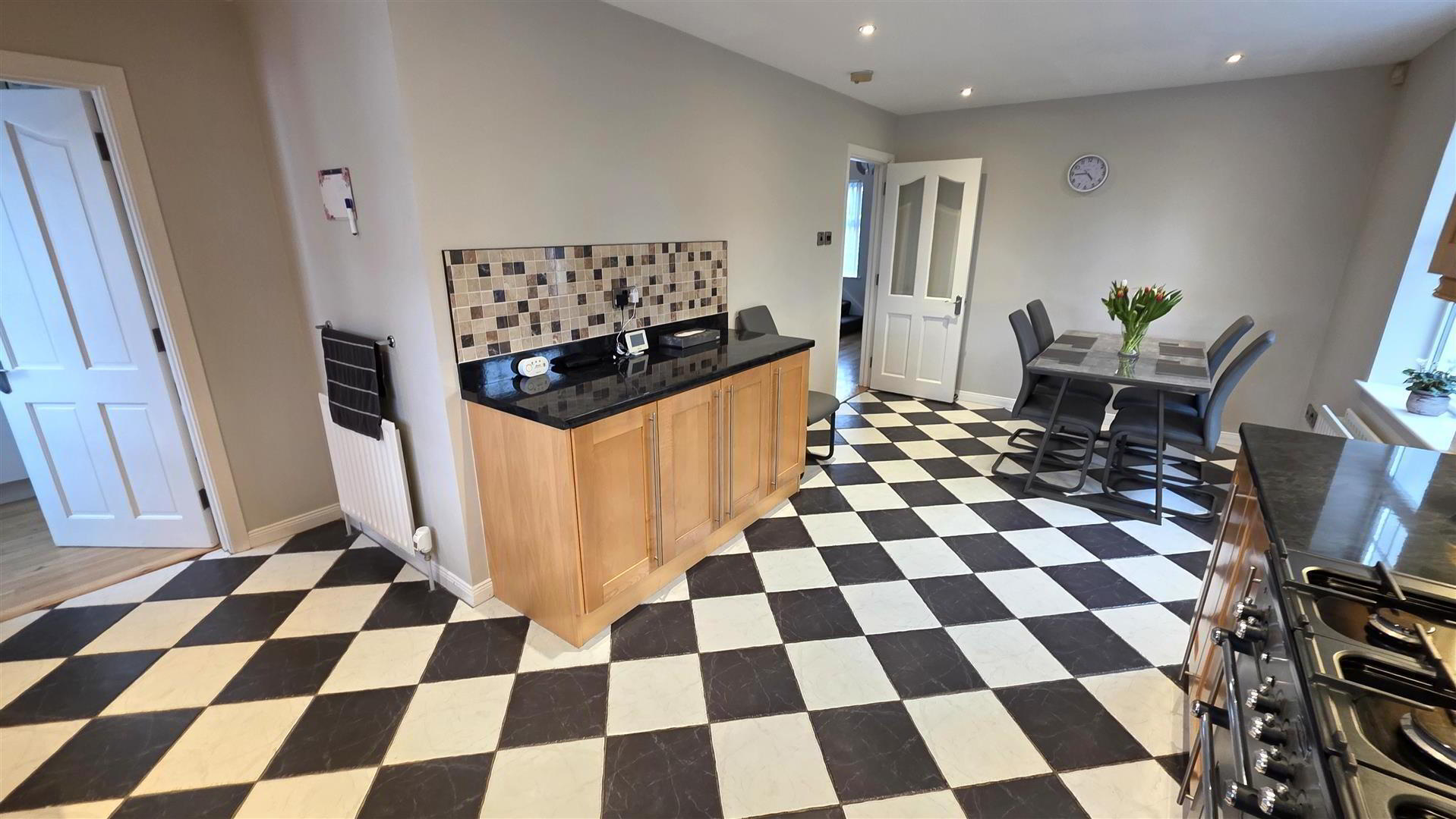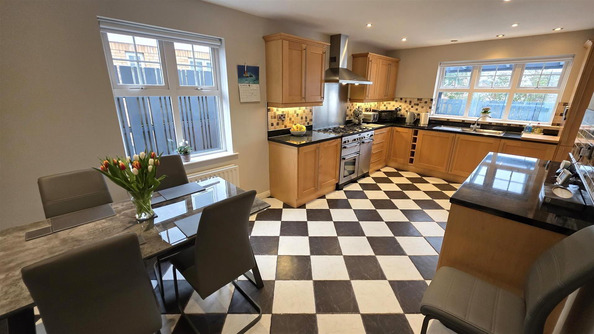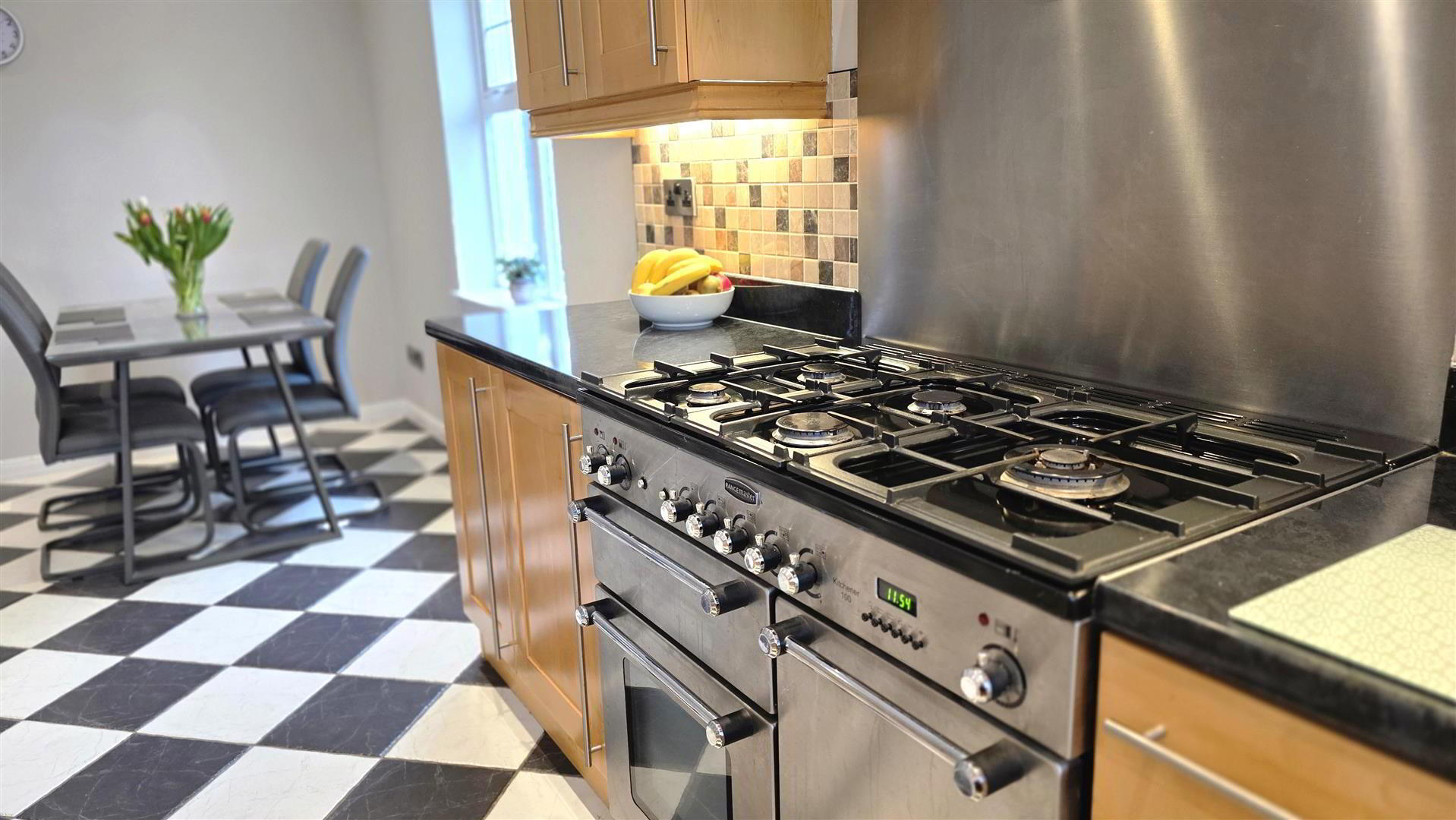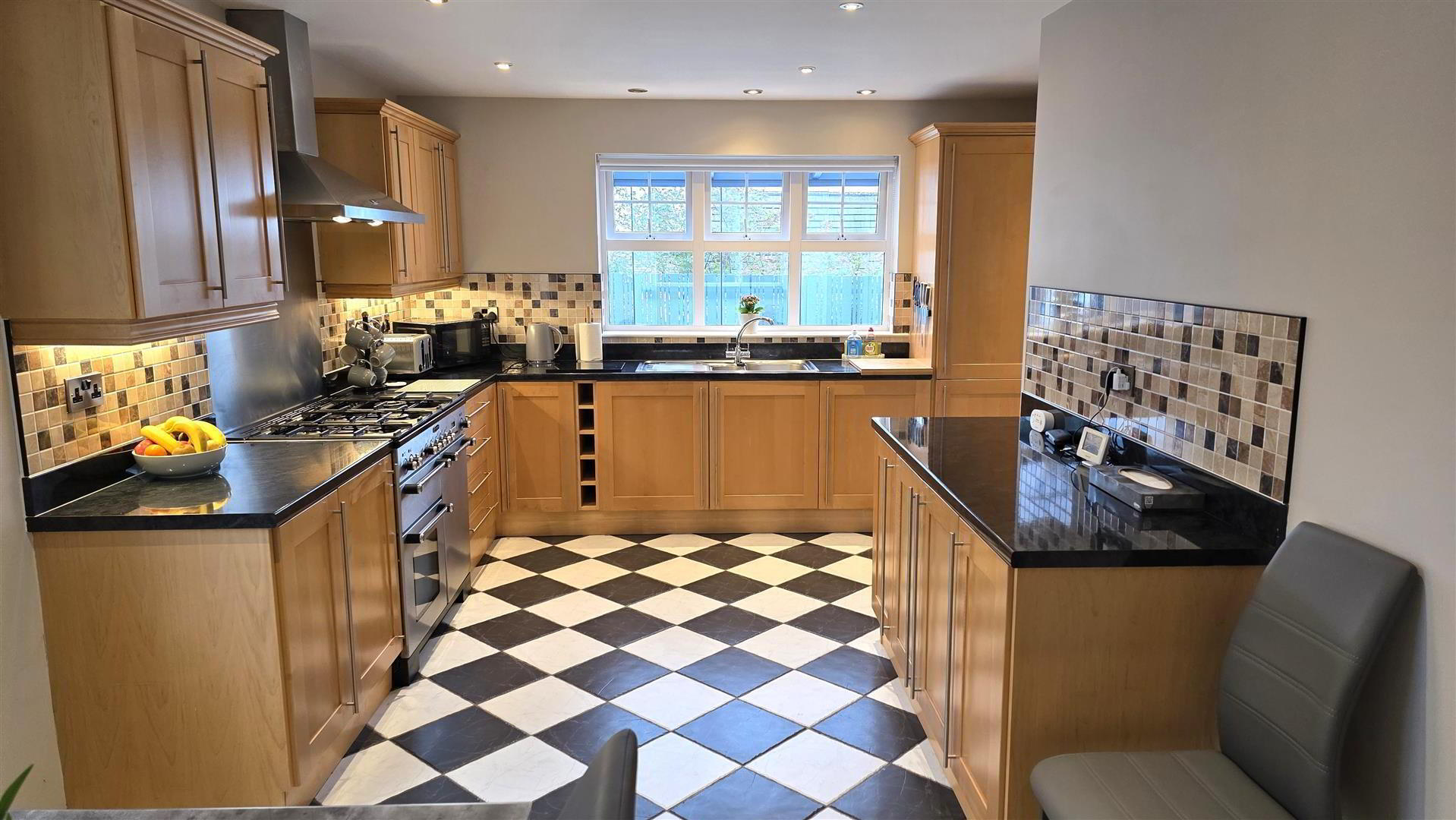 - (max) Full range of beech wood "Shaker" style high and low level units with long chrome handles. Matching low level units with adjoining slide out wicker baskets. Contrasting work surfaces with matching upstand. 11/4 bowl single drainer stainless steel sink unit with antique style mixer taps. Space for range style cooker (plumbed for gas) with wide, stainless steel pyramid style extractor canopy. Stainless steel splash back. Integrated fridge, freezer and dishwasher. Space for recessed microwave. Plumbed for dishwasher. Fully tiled floor. Low voltage downlights. Double radiator and single radiator. Part bevelled glass door to entrance hall. Dual aspect windows. Door to;
