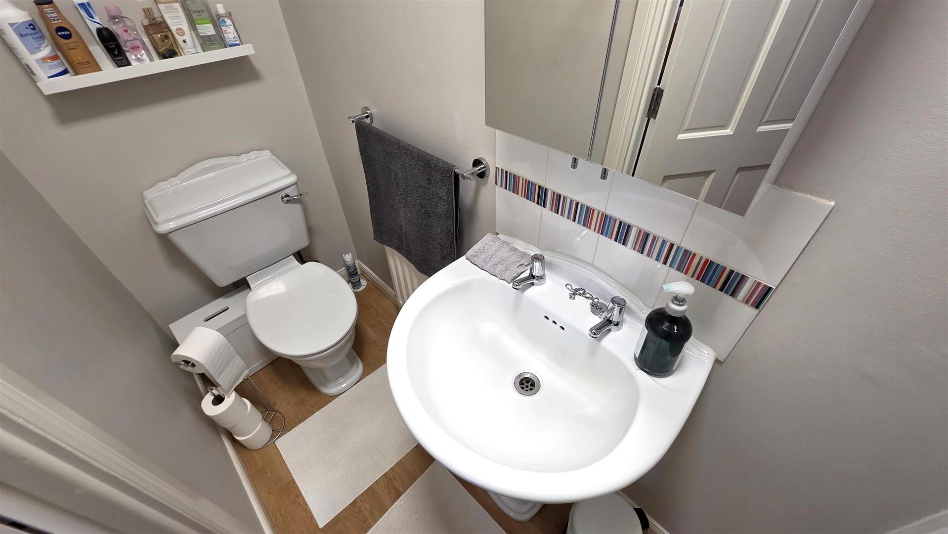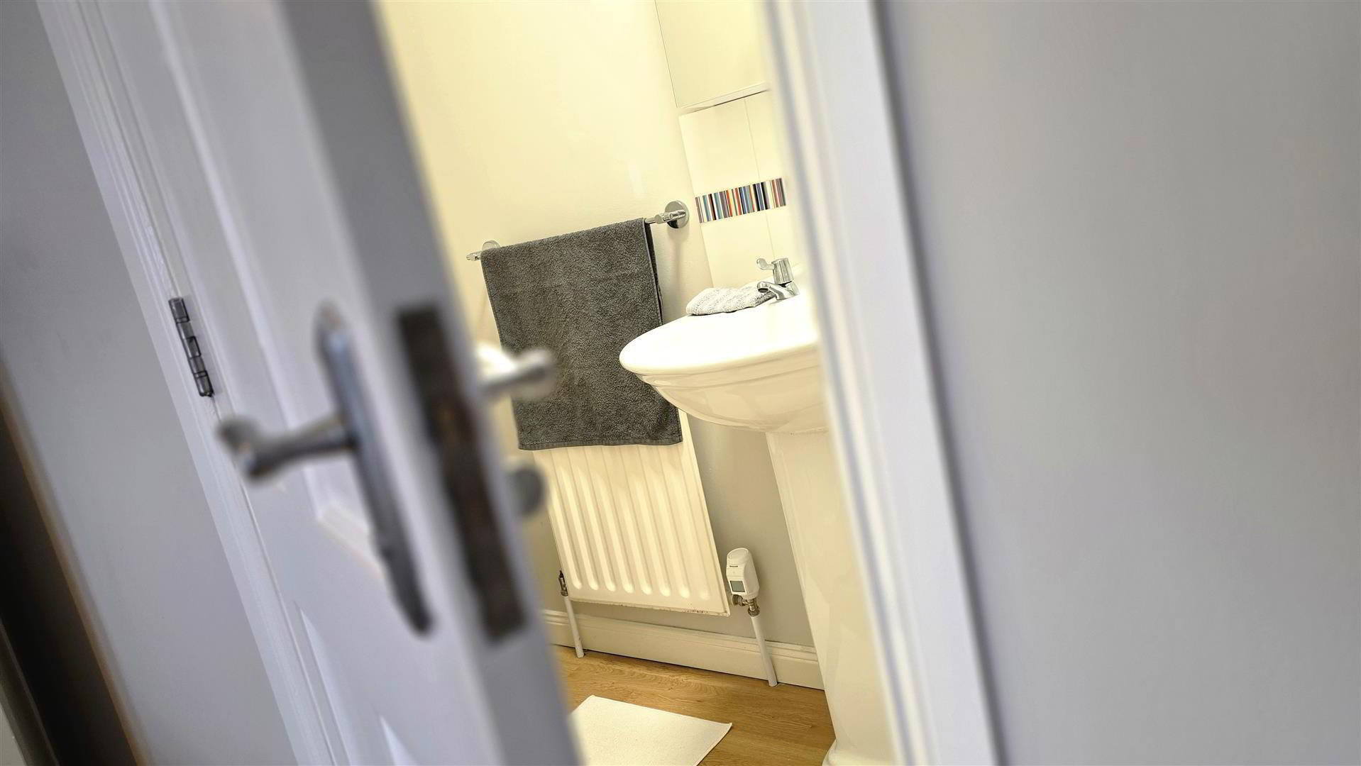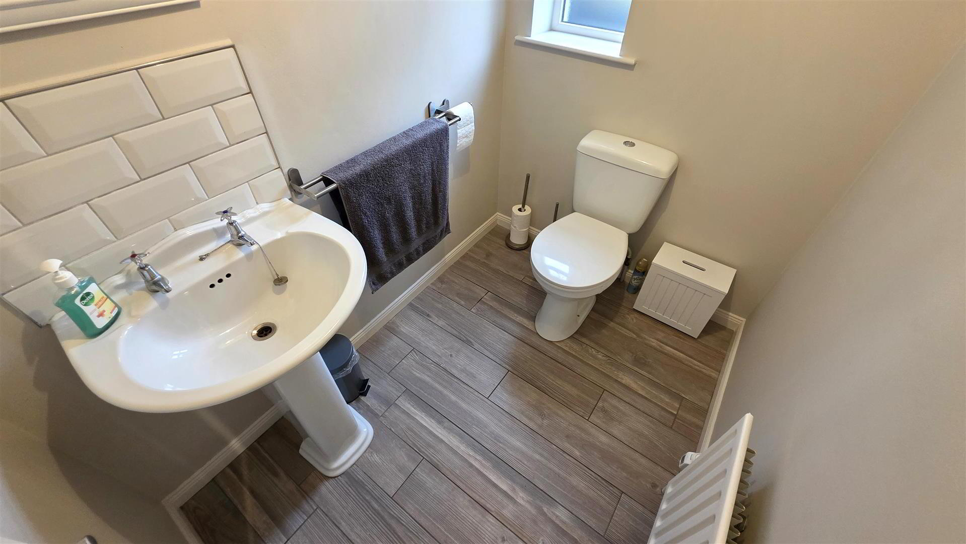 - Modern white suite comprising push button low flush W/C and pedestal wash hand basin with "metro" style tiled splash back. Wood effect fully tiled floor. Single radiator.