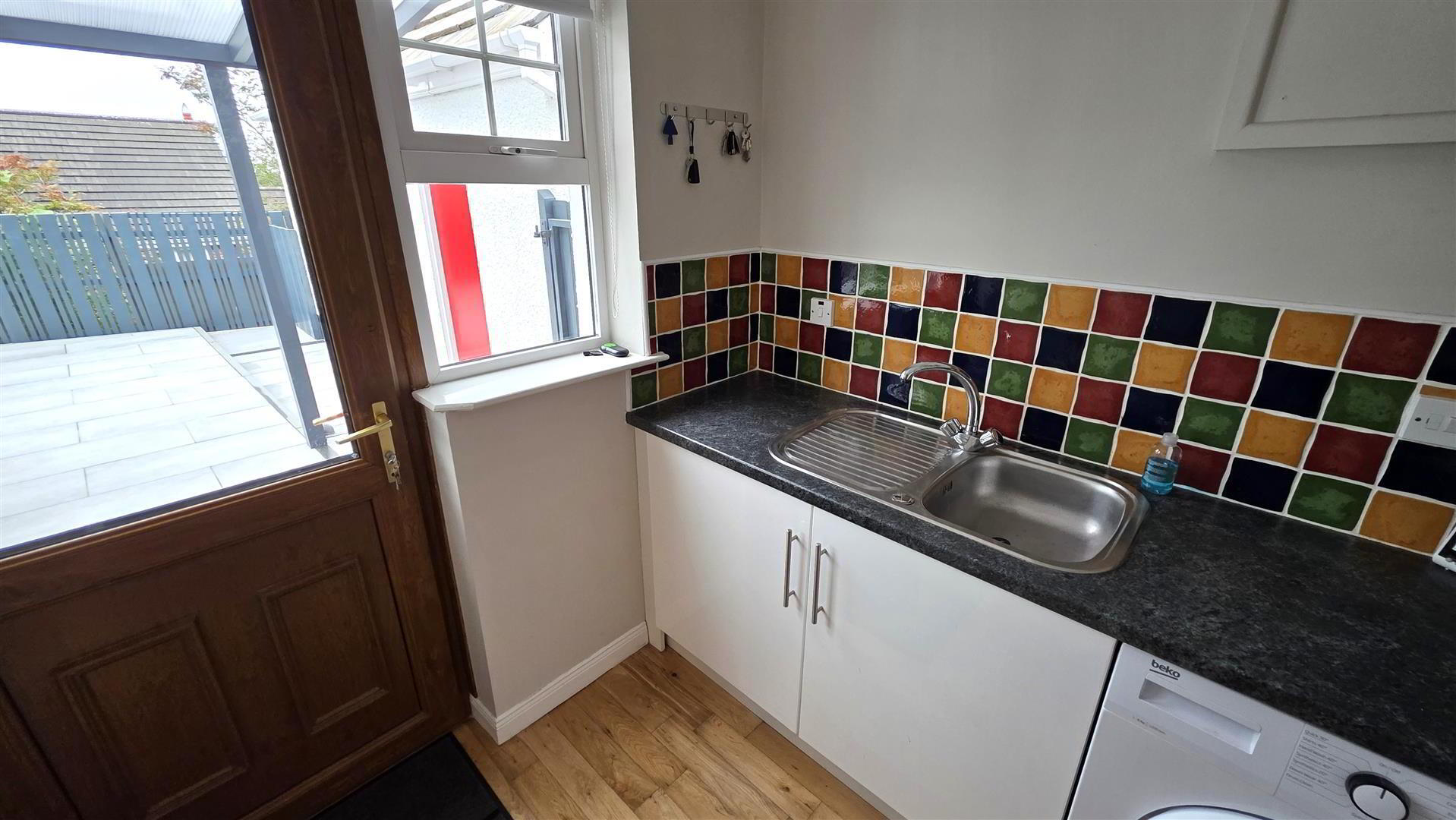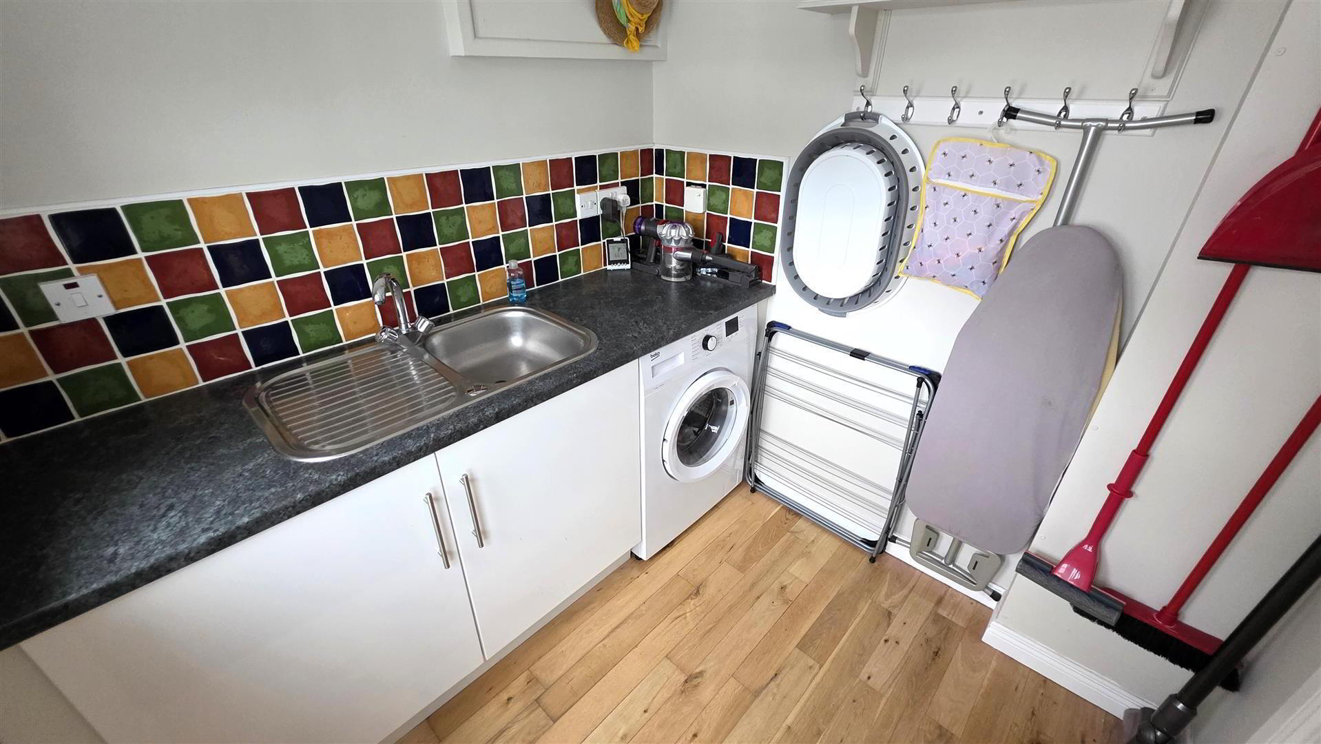 - Matching low level white coloured "Shaker" style units with contrasting work surfaces. Single drainer stainless steel sink unit with mixer taps. Plumbed for washing machine and space for dryer. Partially tiled walls to work surfaces. Solid wood floor. Single radiator. Oak effect PVC double glazed door to rear.