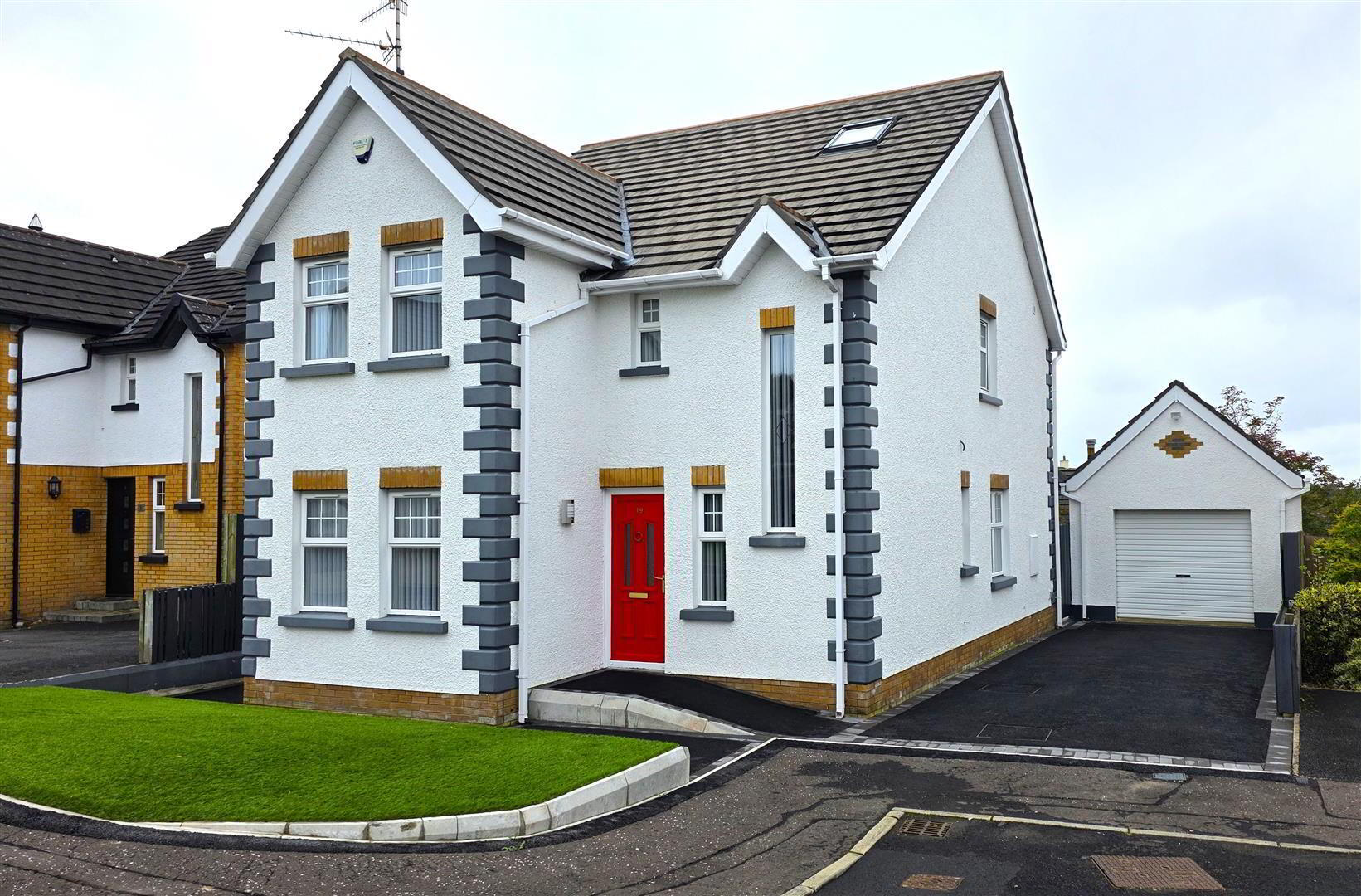 - Garden to front in neat lawn. Paved pathway to front and side with timber pedestrian gateway. Recently tarmacked drive with off-street parking for 2 plus cars. Access to;