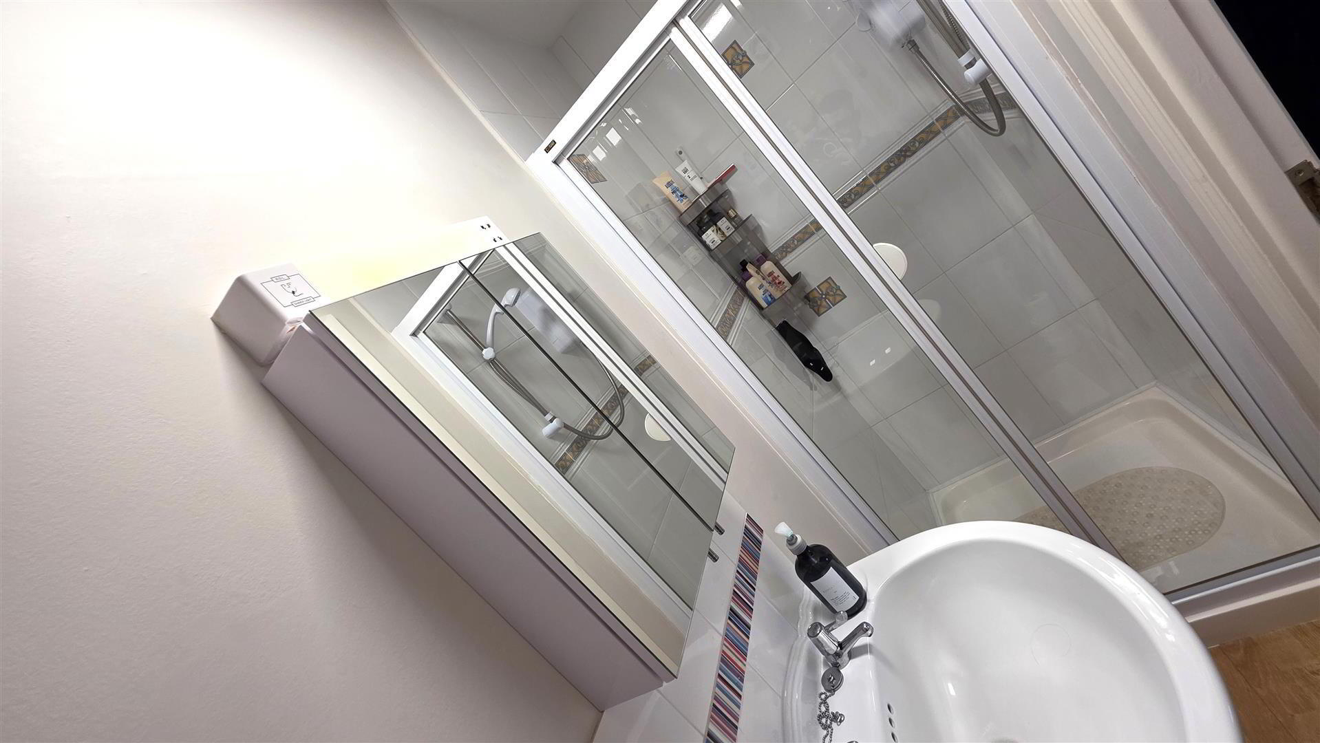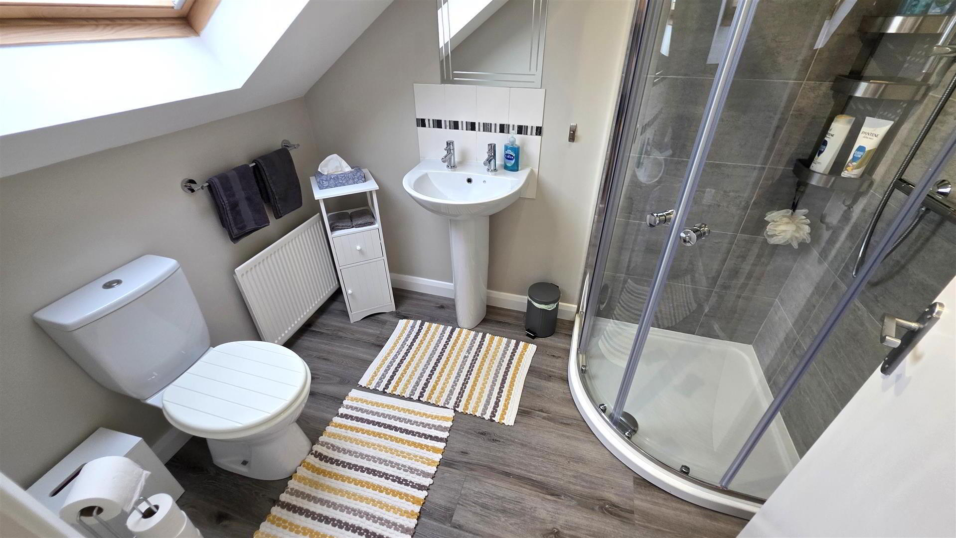 - Modern white suite comprising push button low flush W/C. Pedestal wash hand basin with tiled splash back. Fully tiled corner quadrant shower cubicle with thermostatic shower unit comprising fixed head and hand held shower. Sliding cubicle doors. Low voltage down lights. Extractor fan. "Velux" double glazed roof light. Tiled effect floor. Single radiator.