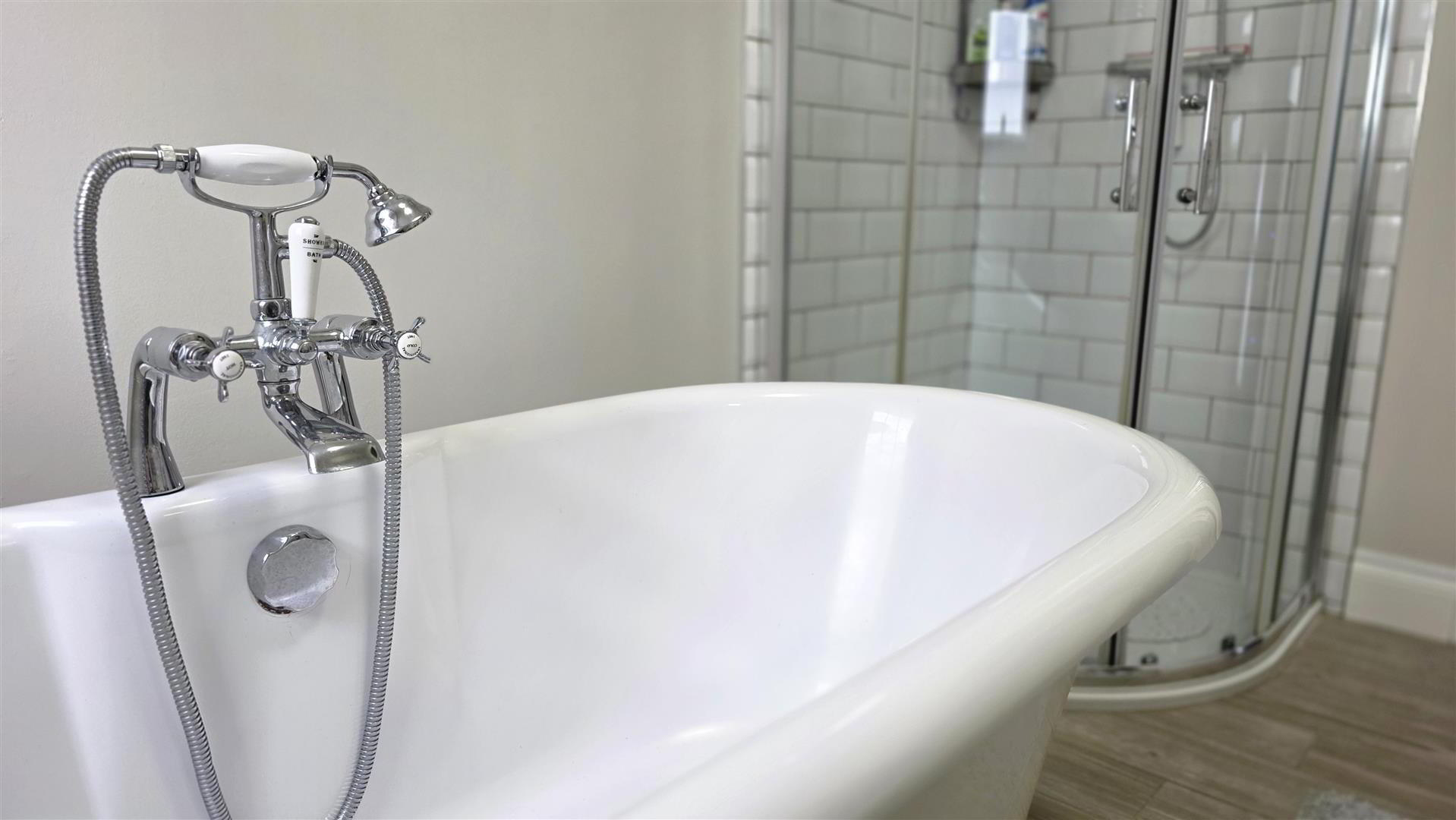 - Modern white victorian style suite comprising free standing roll top, ball and claw bath with antique style telephone hand shower. Low flush W/C, and pedestal wash hand basin. Fully tiled corner quadrant shower cubicle with antique style power shower unit comprising fixed drench head and handheld shower. Sliding cubicle doors. Double radiator. Extractor fan. Woodgrain effect fully tiled floor.