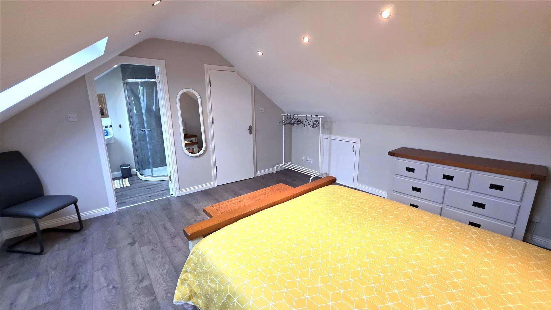 - Wood laminate floor. Double radiator. Access to under eaves storage and fire escape window. 2 No. Double glazed "Velux" roof lights with superb views. Polished chrome low voltage down lights.