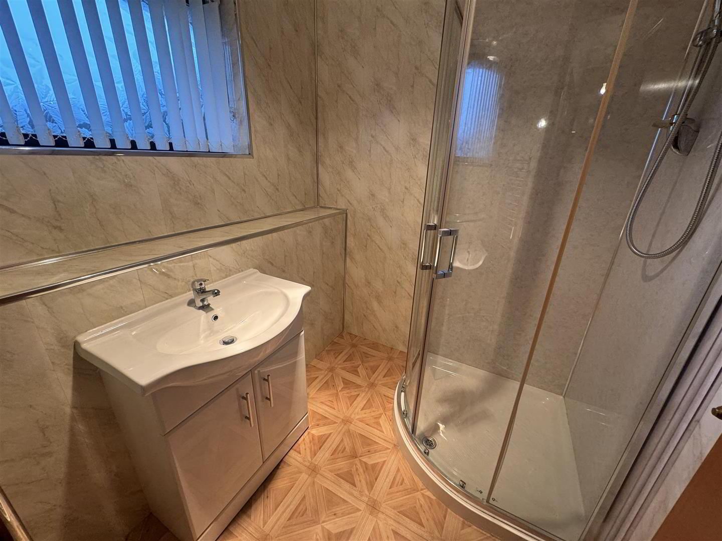 - Comprising quarter rounded shower cubicle with 'Ringshore' electric shower above. Fitted gloss vanity with chrome mixer tap. PVC panelled walls. Chrome towel radiator.