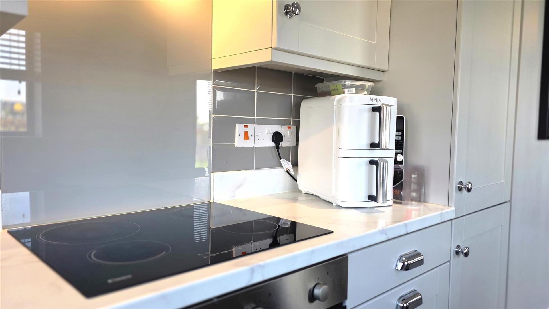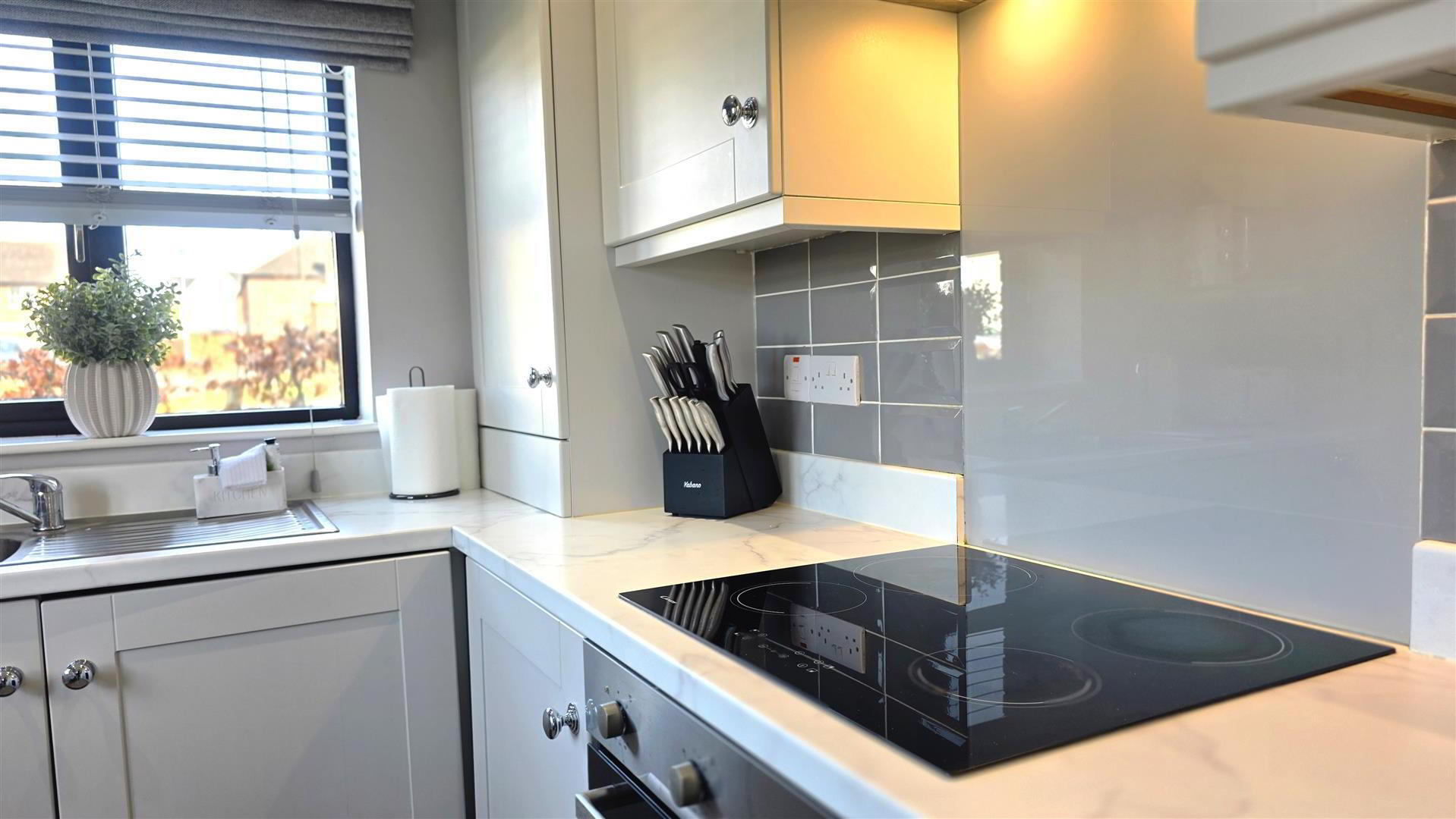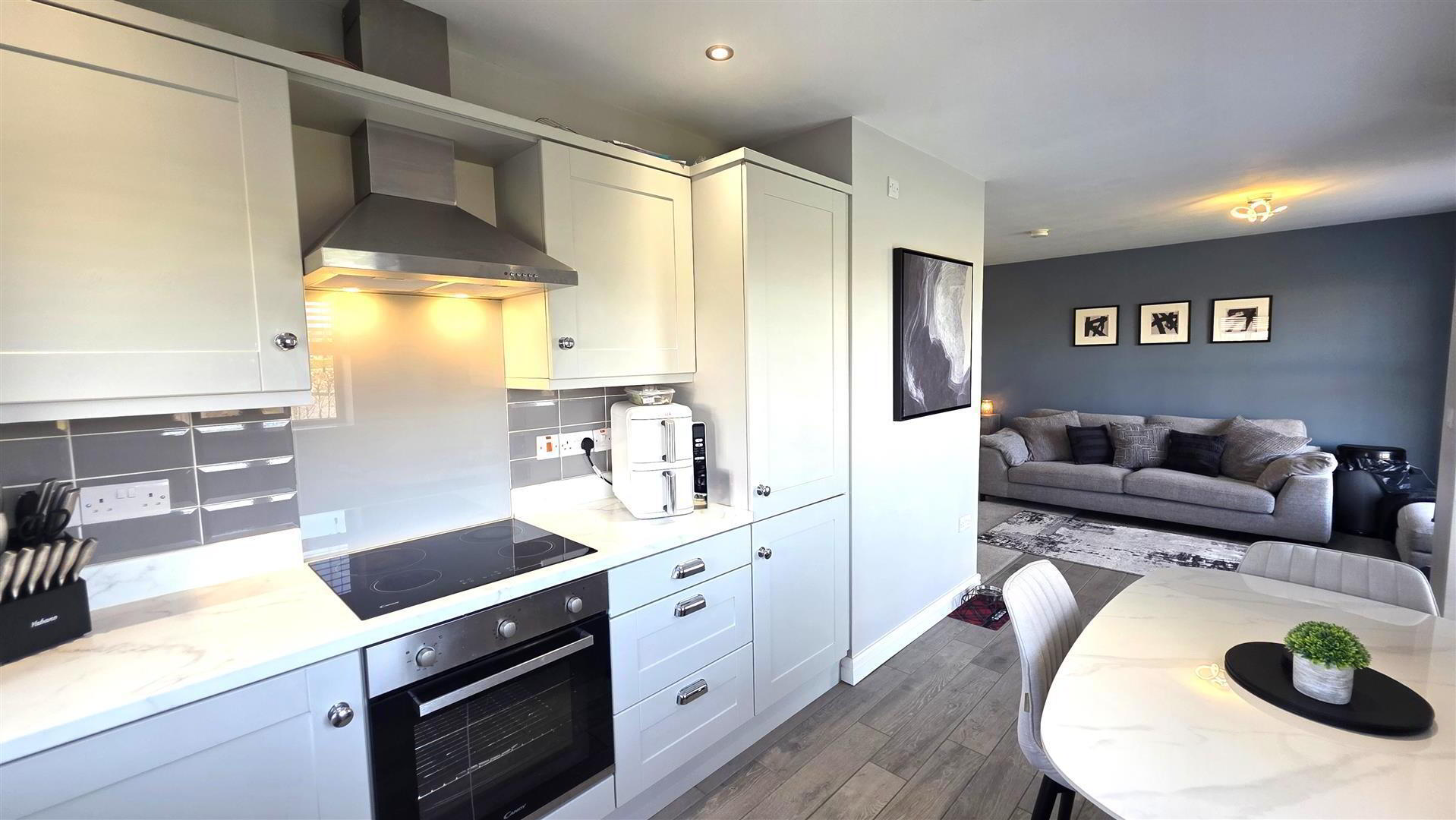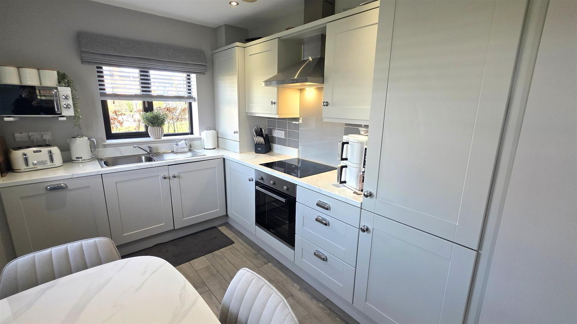 - (at max) Full range of light grey "Shaker" style high and low level kitchen units with complimentary work tops and partial splash back tiling. Single drainer stainless steel sink unit with chrome mixer tap. Integrated appliances to include four ting halogen hob with glass splash back and stainless steel pyramid style over head extractor fan. Low level combination oven/grill, fridge freezer, dish washer and washer/dryer. Fully tiled floor to kitchen dining. Two double radiators. Double glazed PVC door to communal.