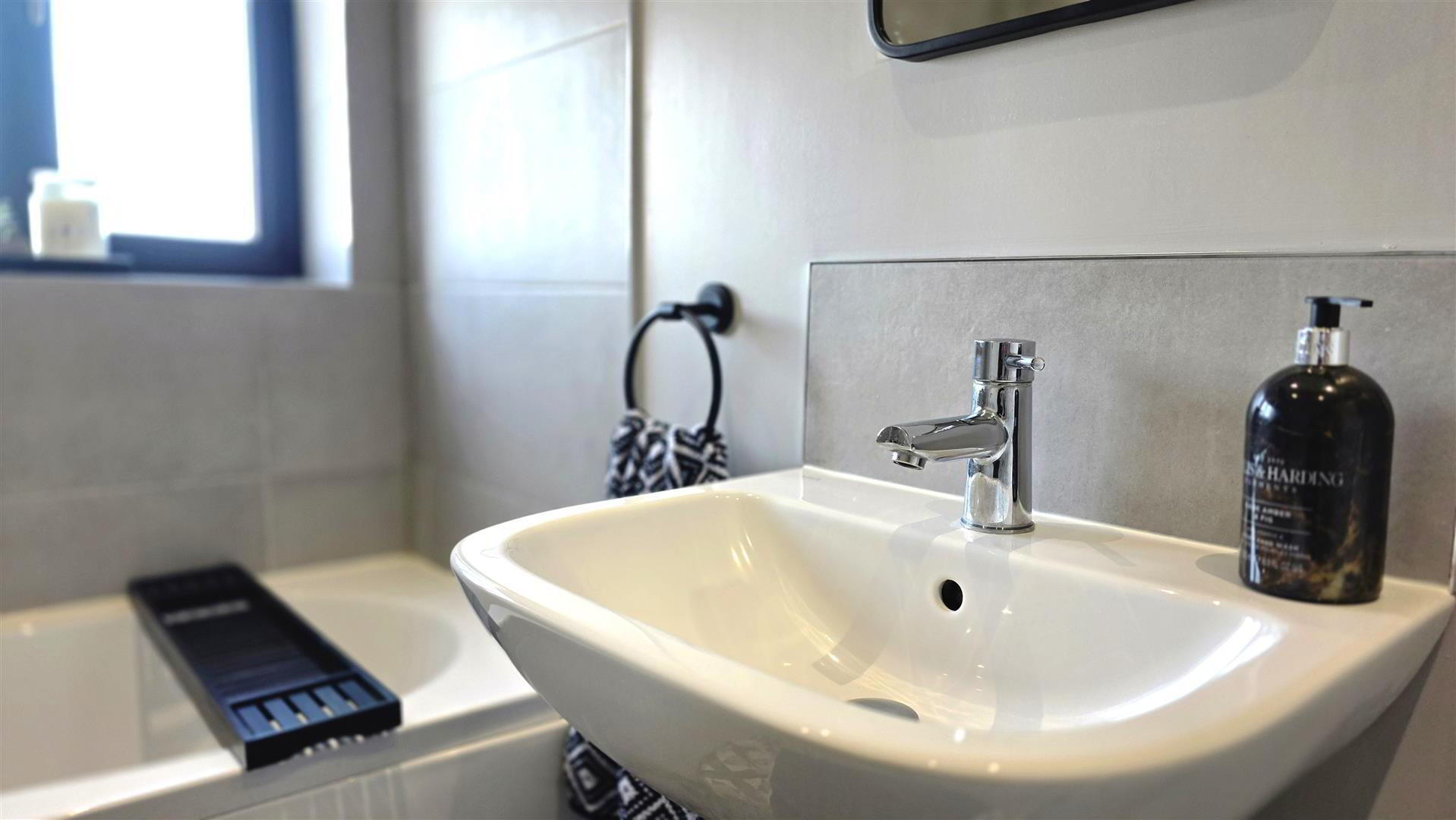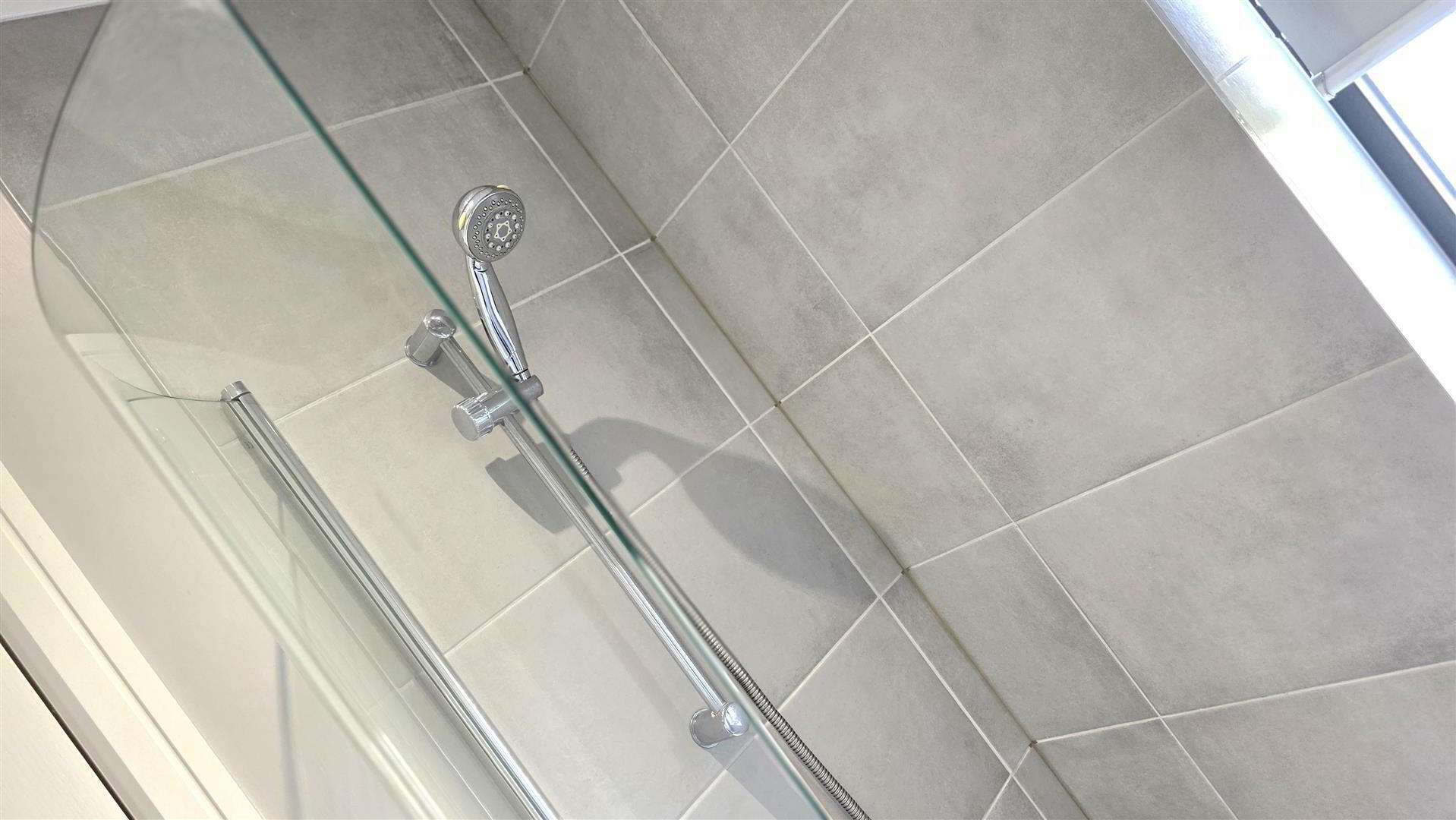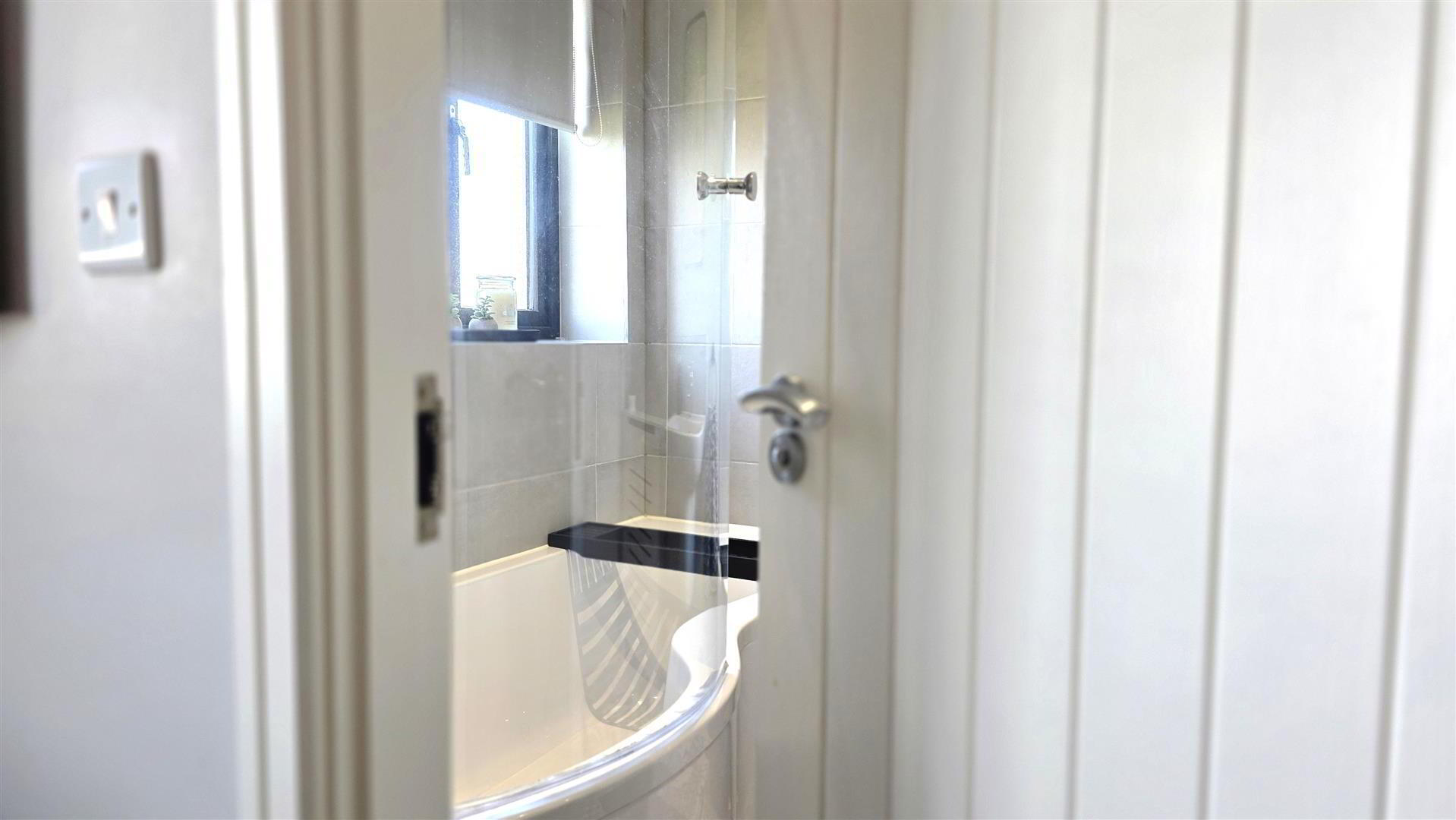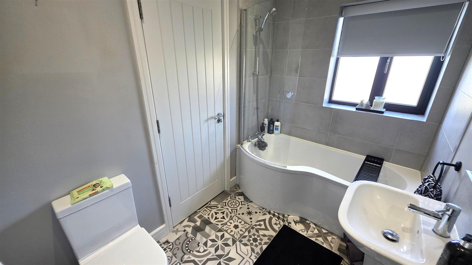 - Modern white suite comprising a "P" shaped panel bath with chrome mixer tap, shower over with partially glazed screen and fully tiled splash back. Half pedestal wash hand basin with "monobloc" chrome mixer tap and tiled splash back. Low flush push button WC. Low voltage down lights. Fully tiled floor. Extractor fan. Single radiator.