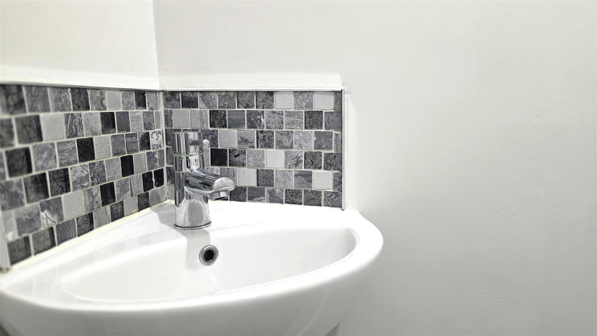 - Modern white suite comprising a pedestal wash hand basin with "monobloc" chrome mixer tap and tiled splash back. Low flush push button WC. Single radaitor.