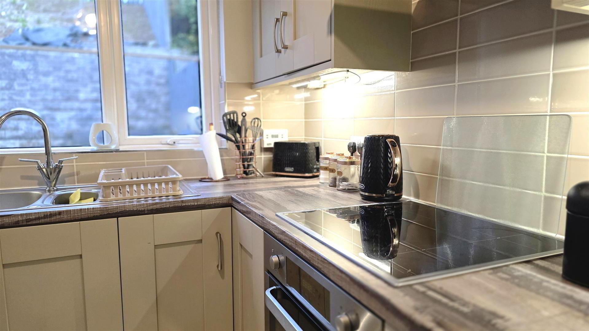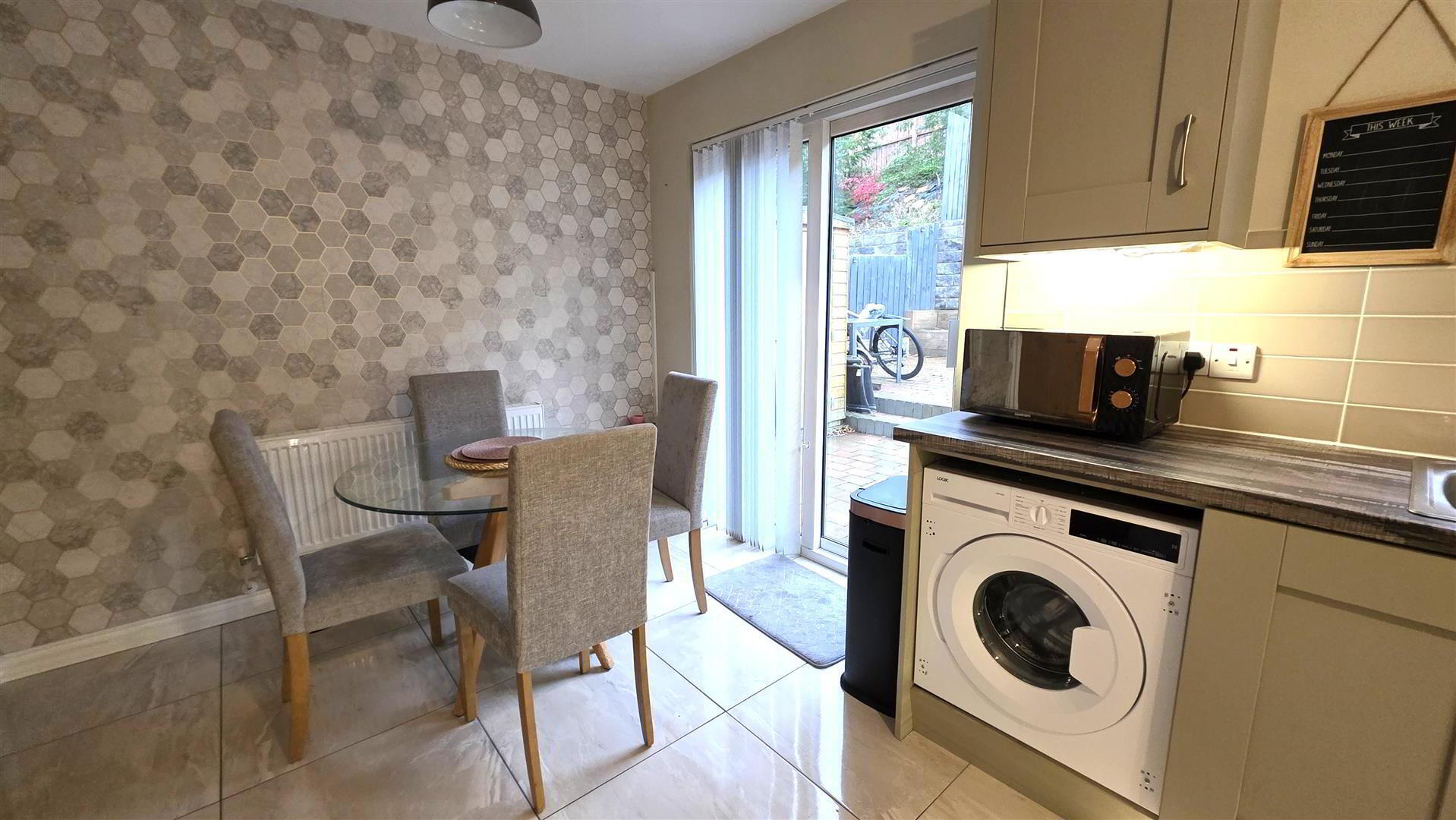 - Full range of light grey wood grain effect "Shaker" style high and low level units with short chrome handles and complimentary work surfaces. One and a quarter bowl single drainer stainless steel sink unit. Integrated four ring halogen hob with stainless steel pyramid style over head extractor fan. Low level combination oven and grill. Integrated fridge, freezer and washing machine. Complimentary wall tiling to work surfaces and fully tiled floor. Bullet lights to kick board. Double glazed patio door to rear. Double radiator.