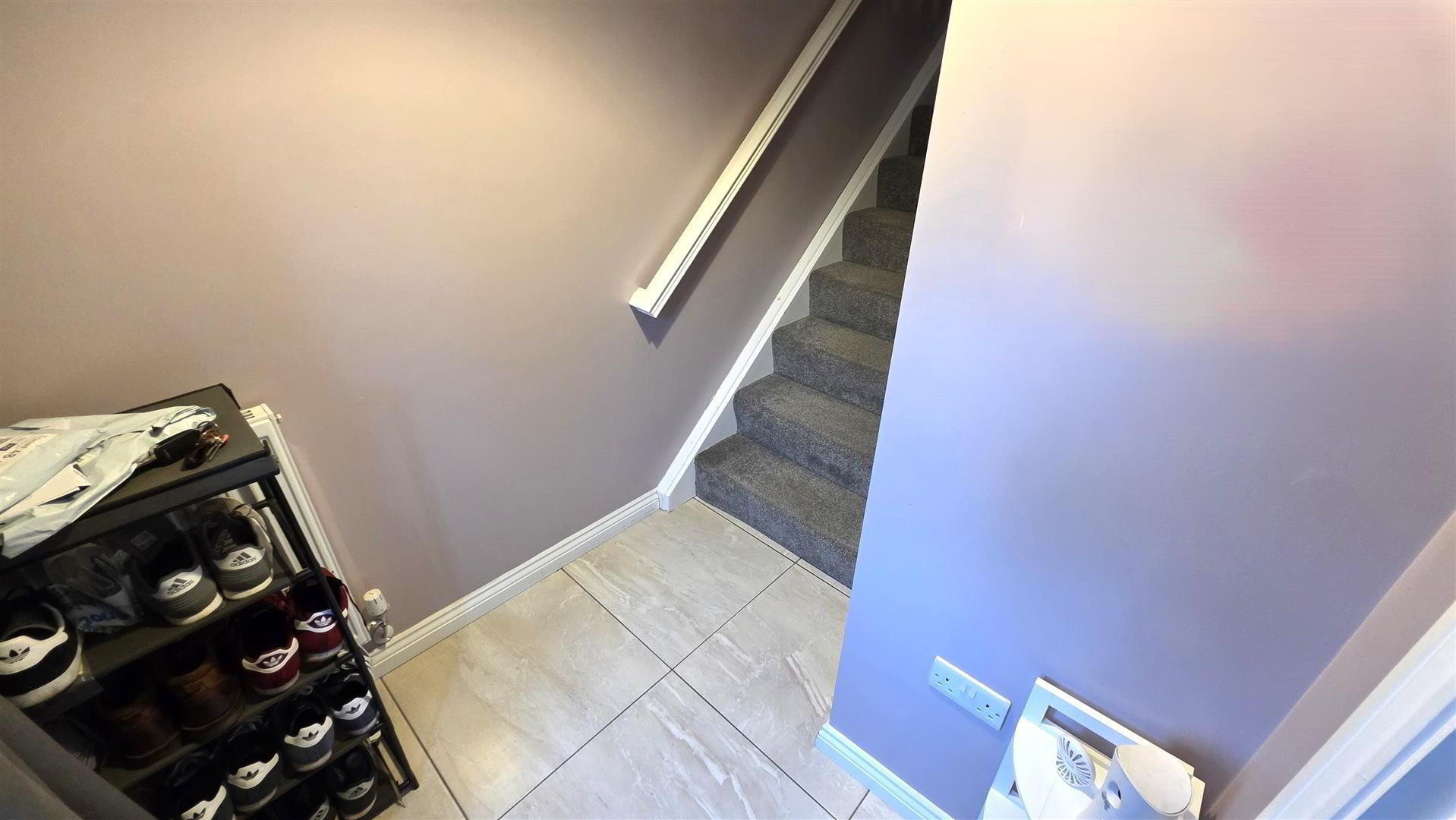 - Polished porcelain fully tiled floor. Moulded hand rail to stair case accessing first floor. Single radiator.