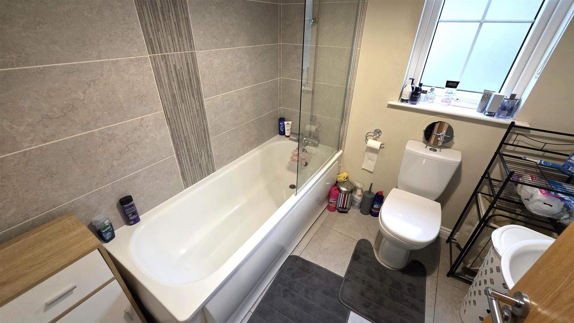- Modern white suite comprising panelled bath with feature mixer taps and shower attachment. Glazed shower screen. Push button low flush W/C and half pedestal wall mounted wash hand basin with "monobloc" mixer tap. Fully tiled walls to bath area and tiled splash back to wash hand basin. Fully tiled floor. Extractor fan. Double radiator.