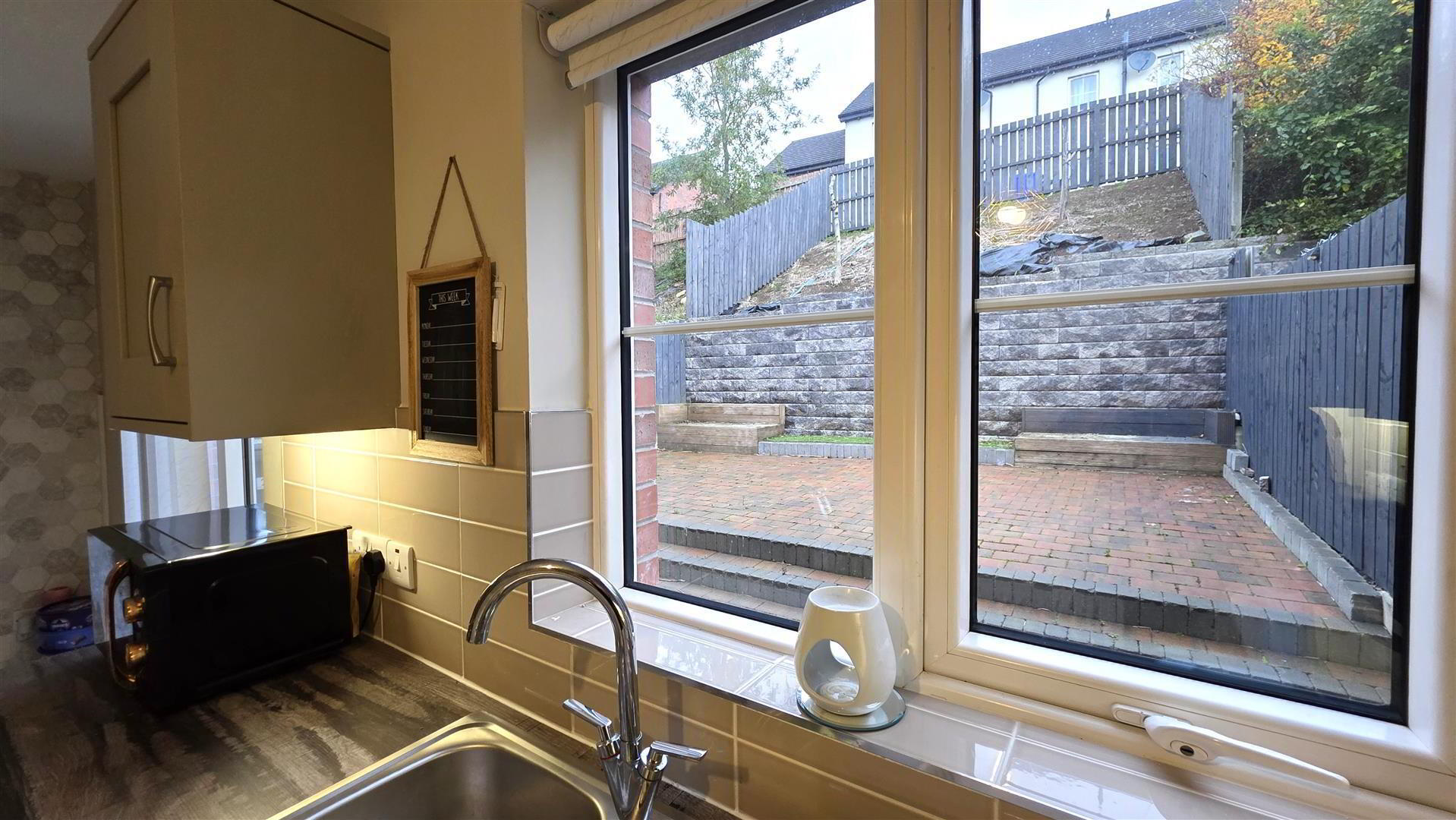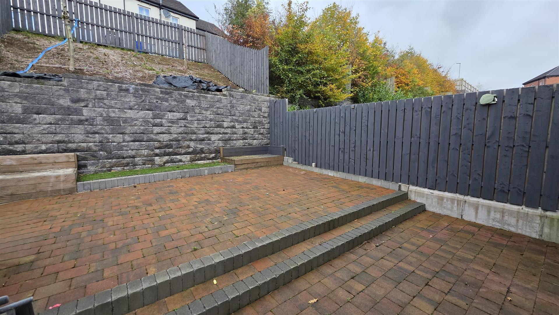 Landscaped gardens to rear in tegula brick patio with contrasting grey brick to steps. Raised tier in matching tegula brick. Built-in bench seating. Area of artificial grass. Feature retaining wall to raised, sloped garden with specimen trees. 5Ft. timber boundary fencing. Outside tap, light and double power socket. - IMPORTANT NOTE TO ALL POTENTIAL PURCHASAERS;