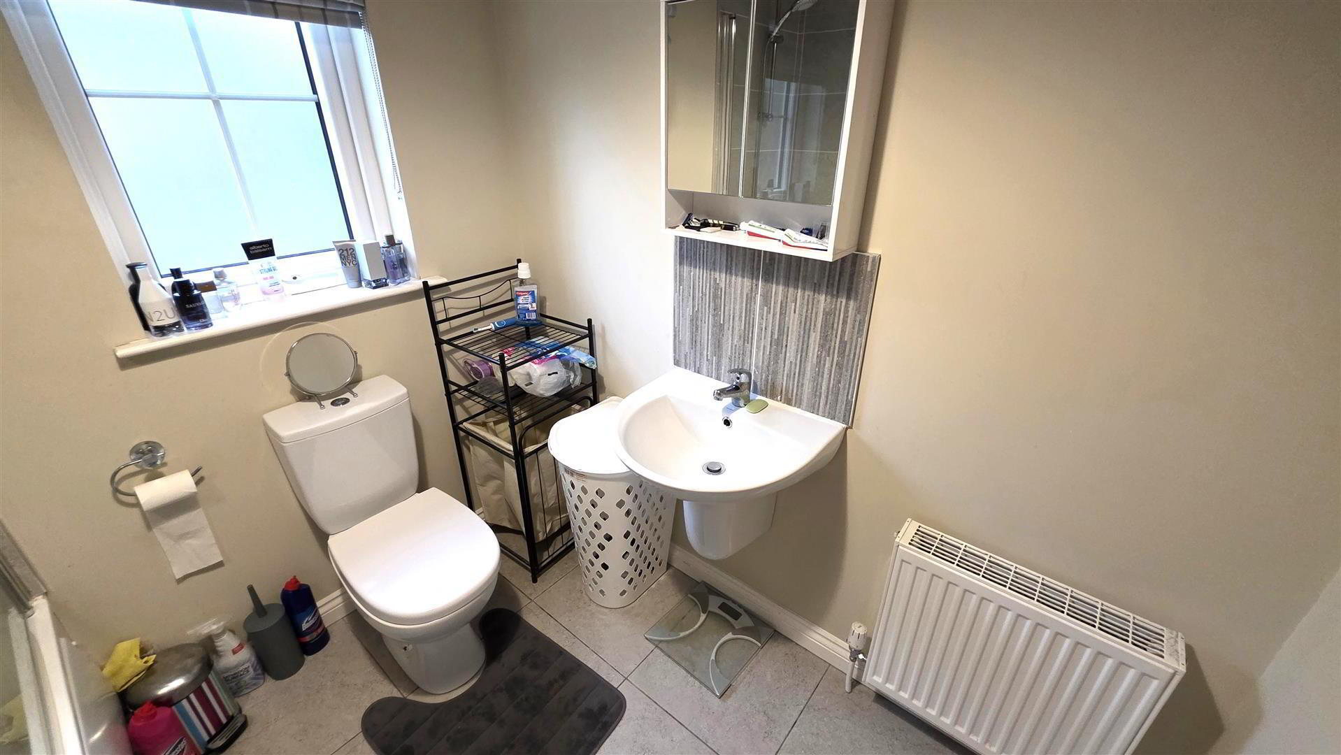 - Modern white suite comprising push button low flush W/C and half pedestal wall mounted wash hand basin with "monobloc" mixer tap and tiled splash back. Fully tiled floor. Gable side window. Single radiator.