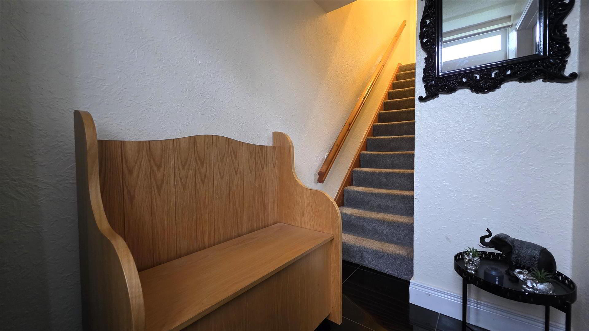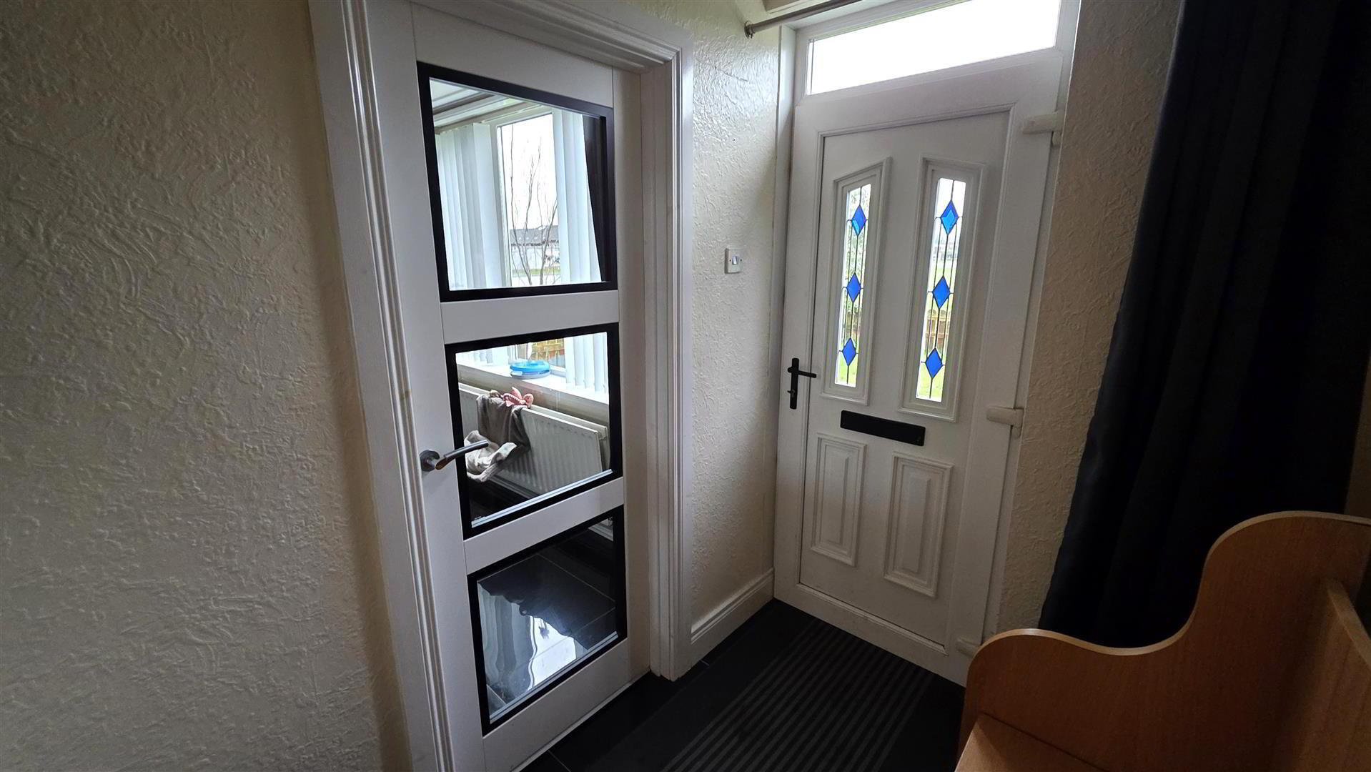 PVC double glazed door to entrance. Staircase to first floor with moulded handrail. Fully tiled floor. Single radiator. Three panel glass door to;
