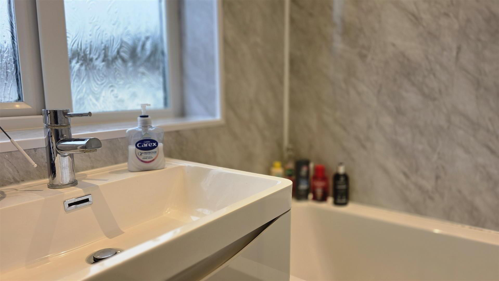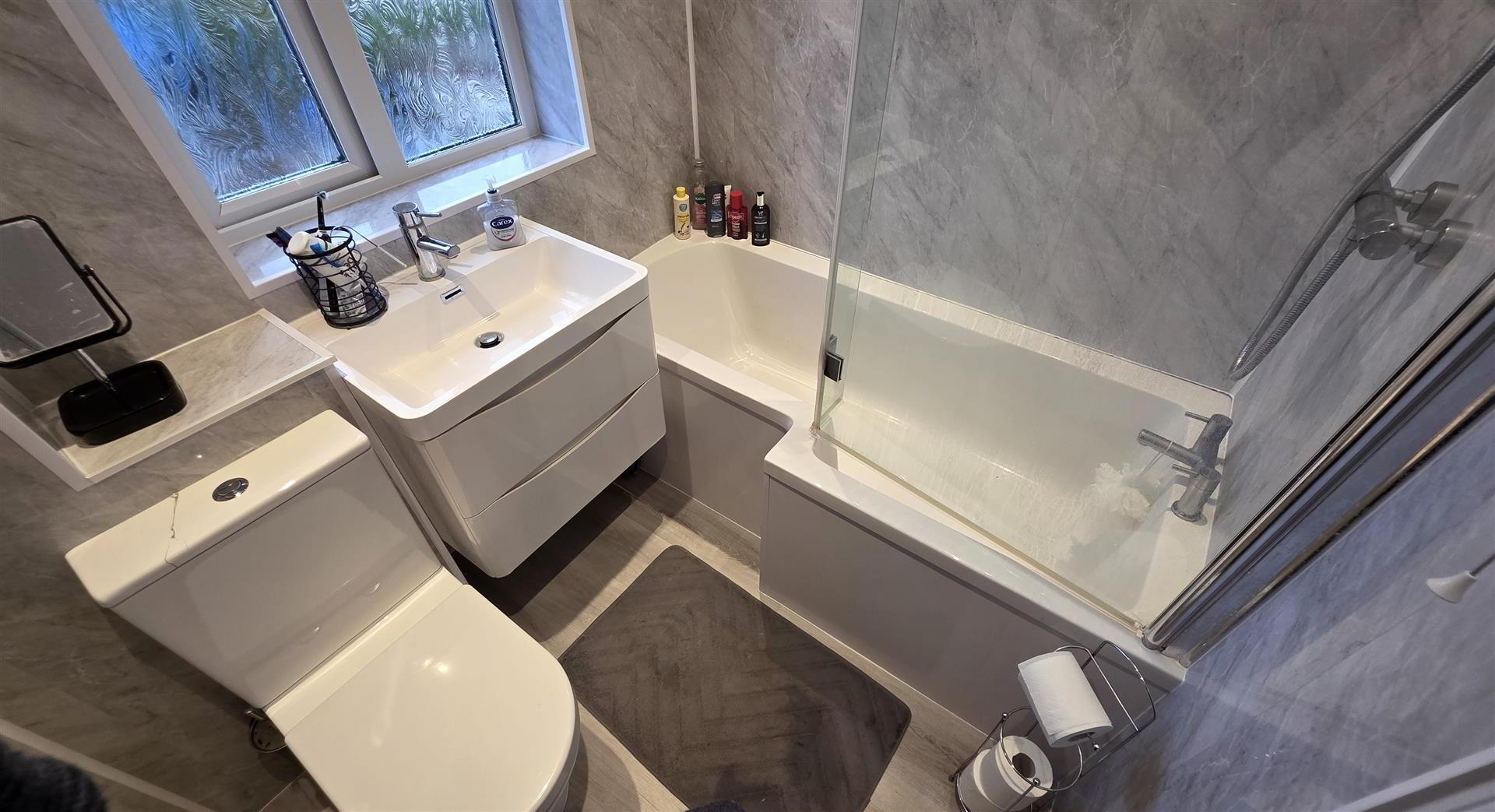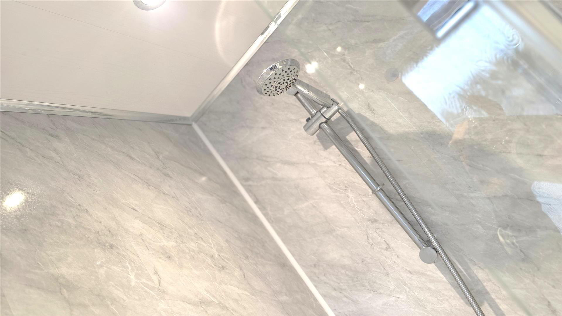 Modern white suite comprising a 'P' shaped panel bath with mains shower over and partially glazed screen. Wall mounted wash hand basin with 'monobloc' chrome mixer tap and storage below. Low flush push button WC. PVC wall panelling. Low voltage downlighting. Chrome towel radiator.