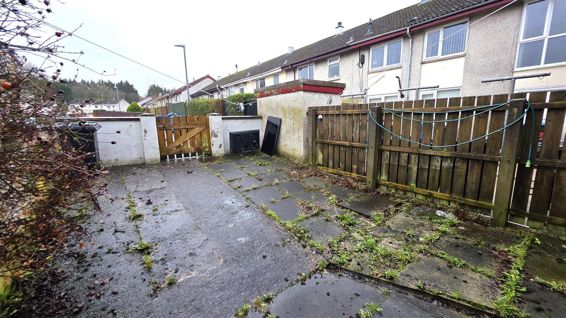 Fully fully included low maintenance rear garden. Part paved and part concrete yard area. Wall borders and timber pedestrian gate to rear and communal parking. Outside tap and outside lighting.