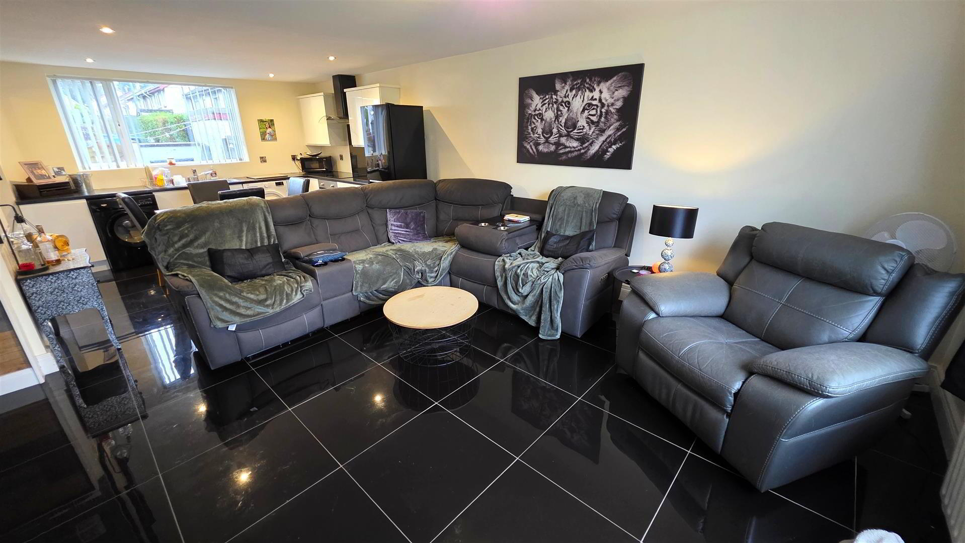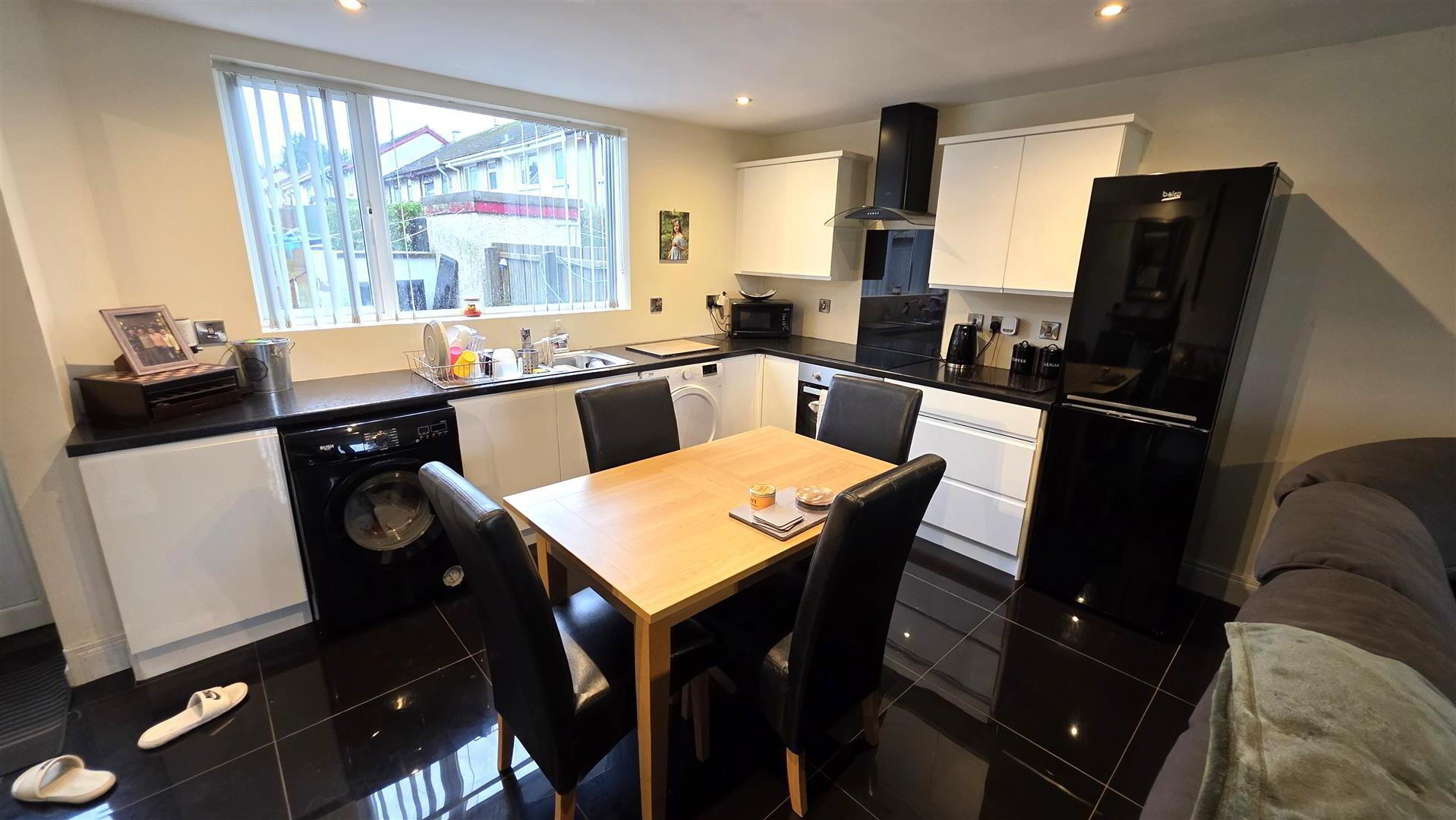 Full range of white contemporary style handle less high and low level kitchen units with contrasting work surfaces. One and one quarter bowl stainless steel sink unit with chrome mixer tap. Integrated appliances to include a four ring halogen hob with stainless steel and glass overhead extractor fan and glass splashback. Low level combination oven and grill. Space for fridge freezer, washing machine and tumble dryer. Low voltage downlighting to kitchen area. Fully tiled floor. Understander stairs storage cupboard. Double radiator. Double glazed PVC door two rear.