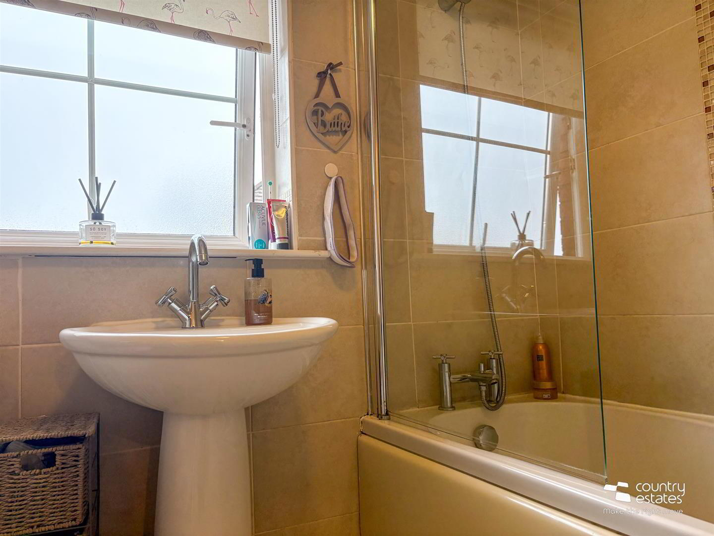- Comprising button flush w.c, panelled bath with fixed shower screen and shower attachment and floating gloss vanity unit with monobloc tap. Tiled floor. Part tiled walls.