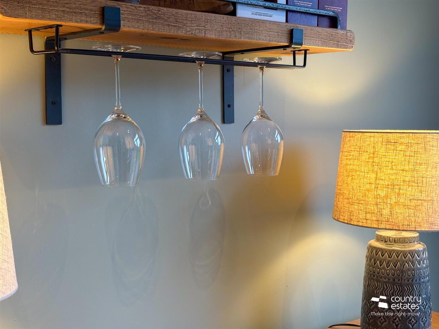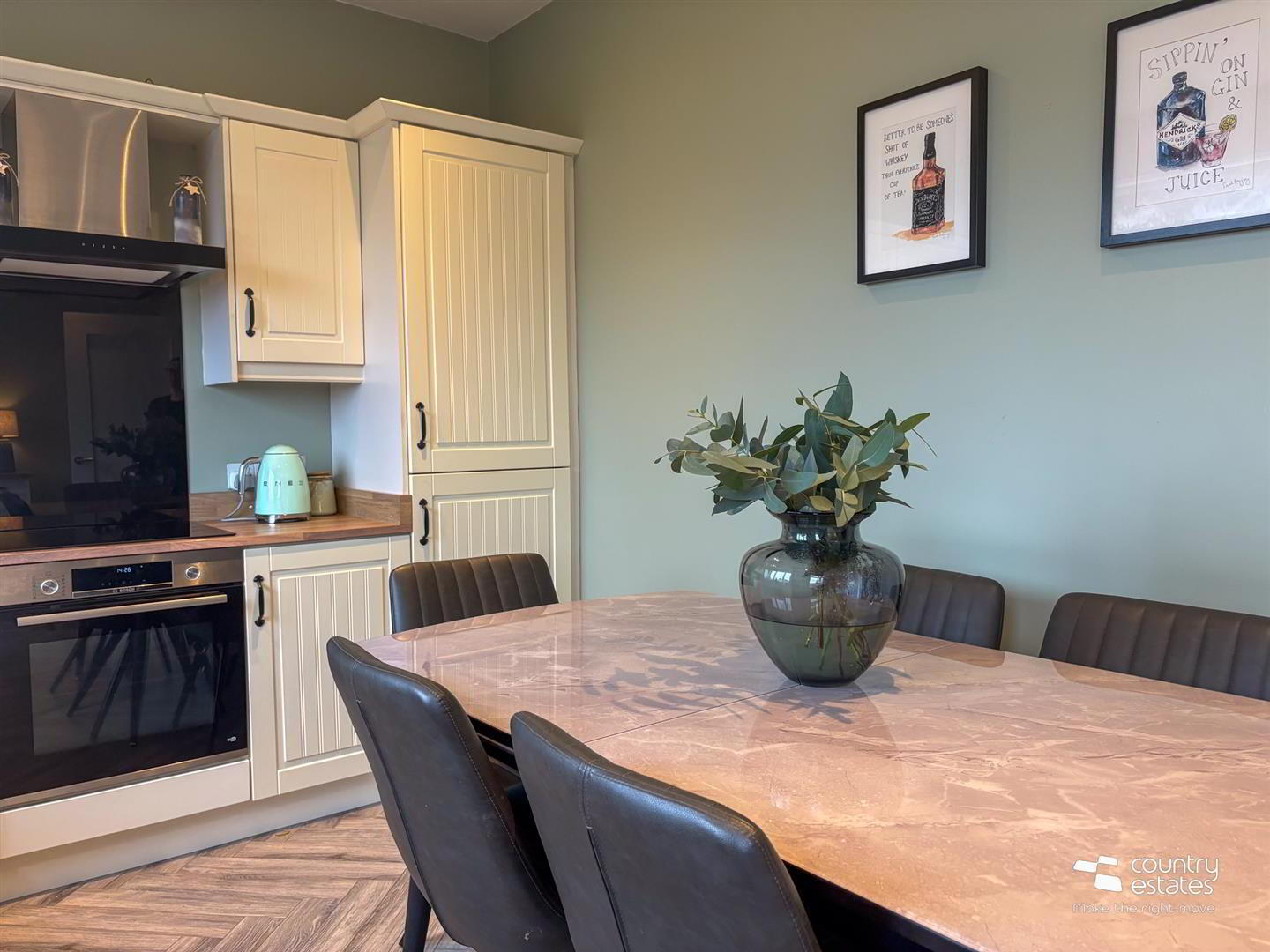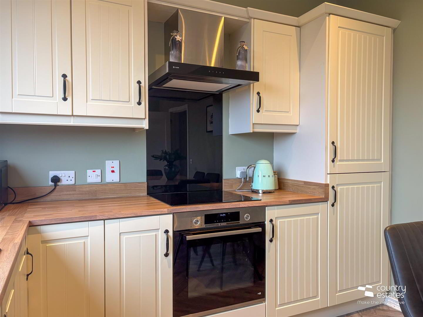 - Equipped with a comprehensive range of high and low level fitted units in cream finish with new installed contrasting work surfaces. Inlaid Single drainer black quartz sink unit. A range of integrated appliances including newly installed oven with separate 4 ring hob, overhead extractor fan housed in stainless steel canopy, fridge freezer and dishwasher. Plumbed for washing machine. Herringbone laminate flooring. Part tiled walls. Twin composite double glazed doors to patio and garden.