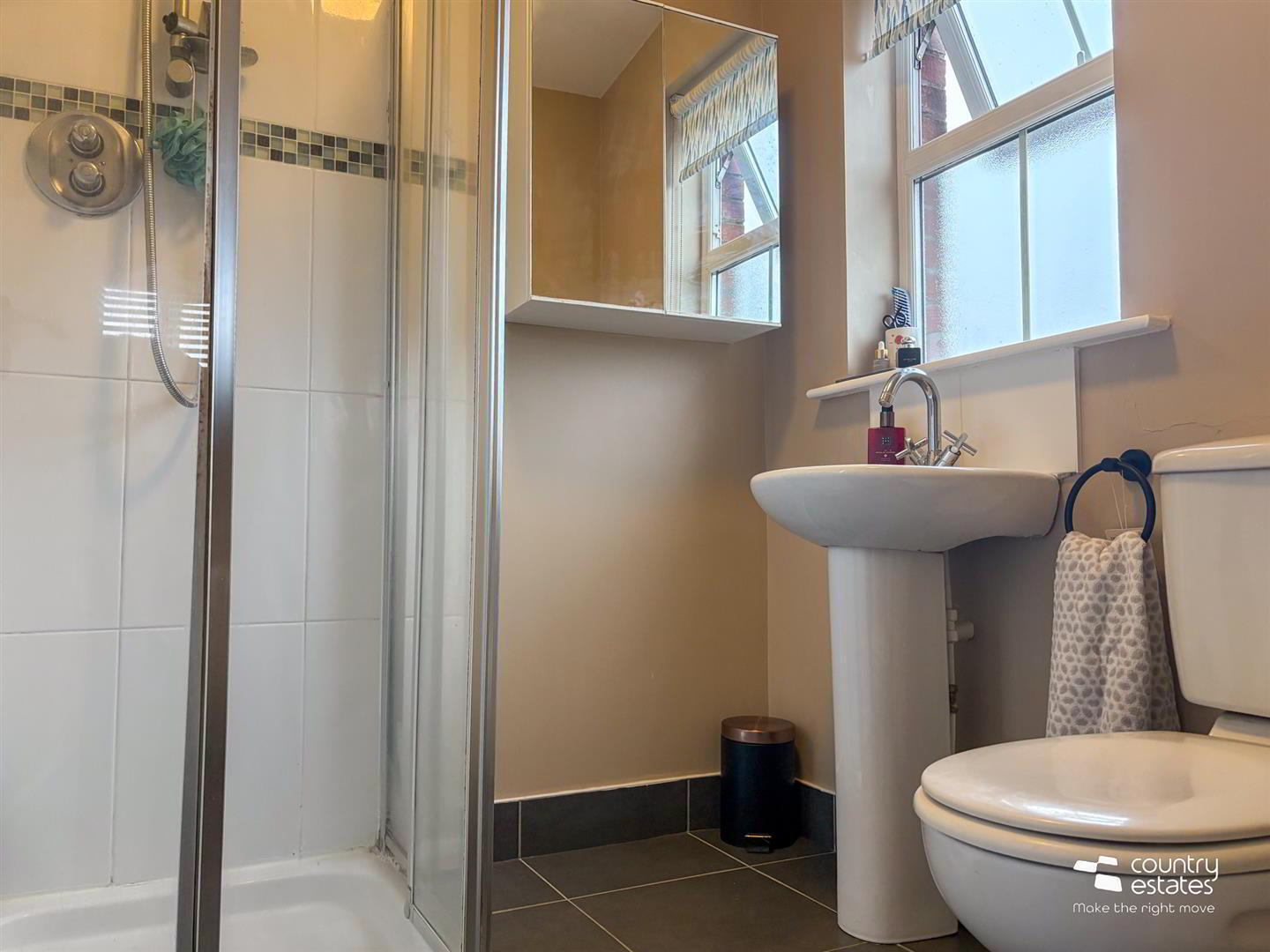 - Comprising button flush w.c, floating gloss vanity unit with monobloc tap and feature tiled accent panel, quarter rounded shower cubicle. Tiled floor.
