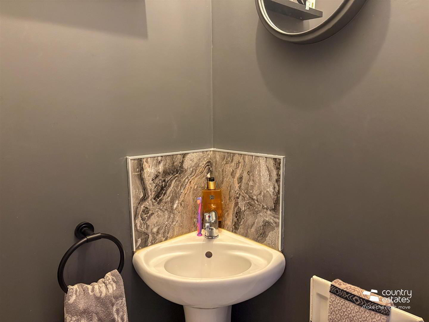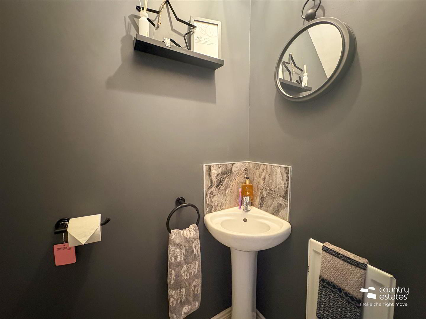 - Comprising button w.c. and pedestal wash hand basin with tiled splashback.